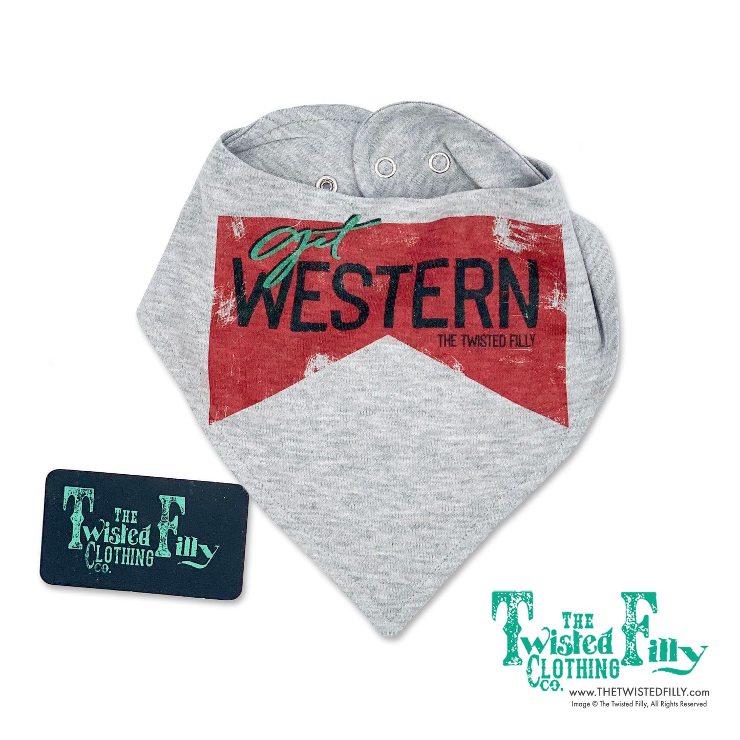 Round up your happy Cowkids stray grub with this one of a kind punchy bandanna style bib. 2 snap adjustable closure for easy and secure use. Our bibs are 65% Poly and 30% Cotton and softer than your Mamma's mashed taters! We know you and your cowboy or cowgirl babe will love this bib!