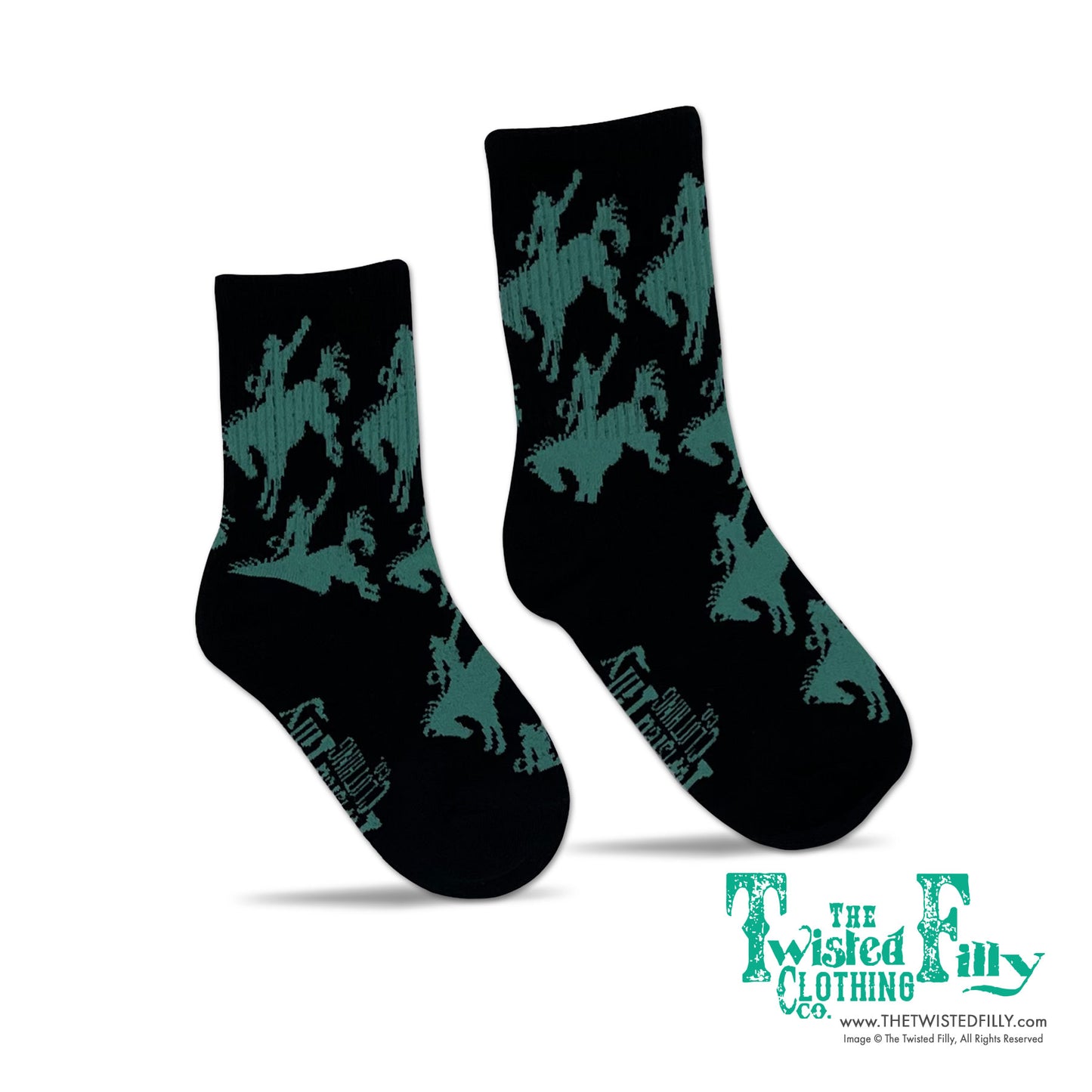 Cow Boy socks also available! This listing is for 1 pair of the youth black/turquoise bronc rider socks.