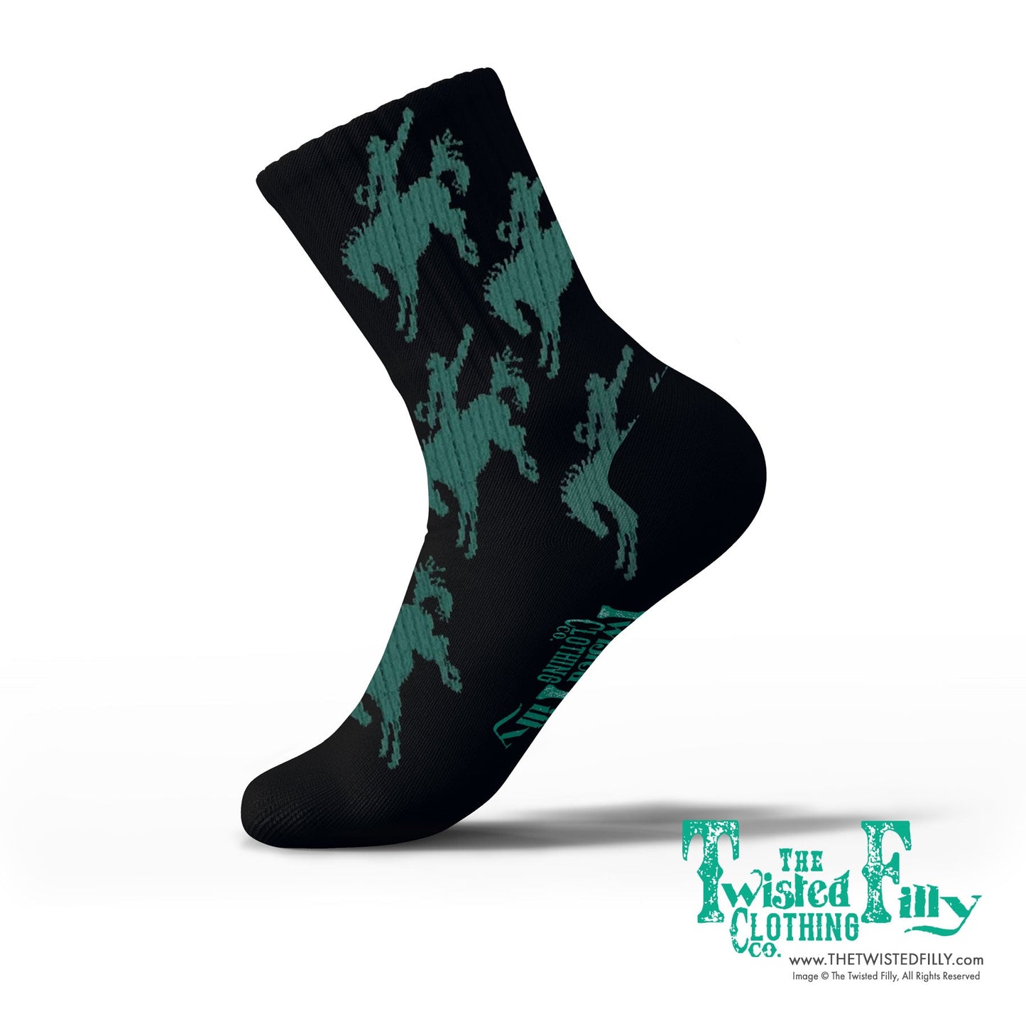 Cow Boy socks also available! This listing is for 1 pair of the toddler black/turquoise bronc rider socks.
