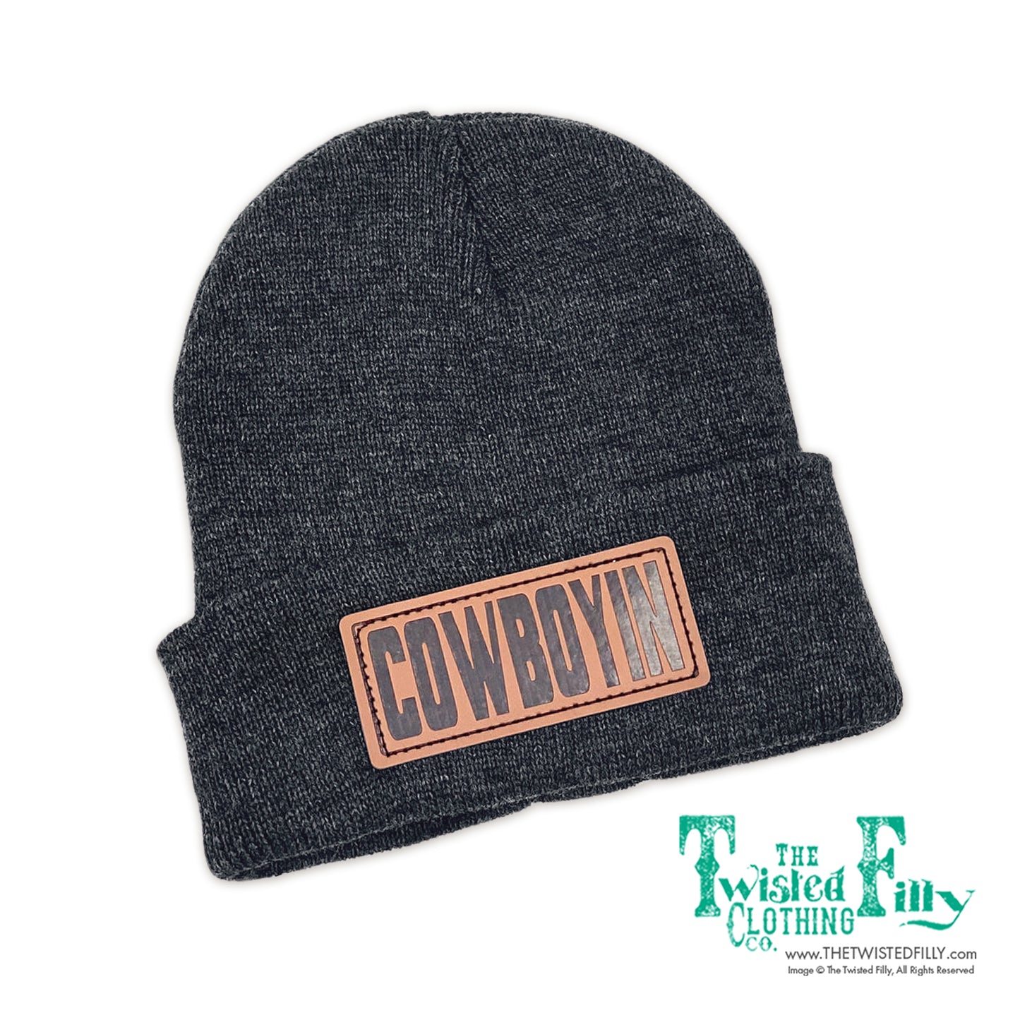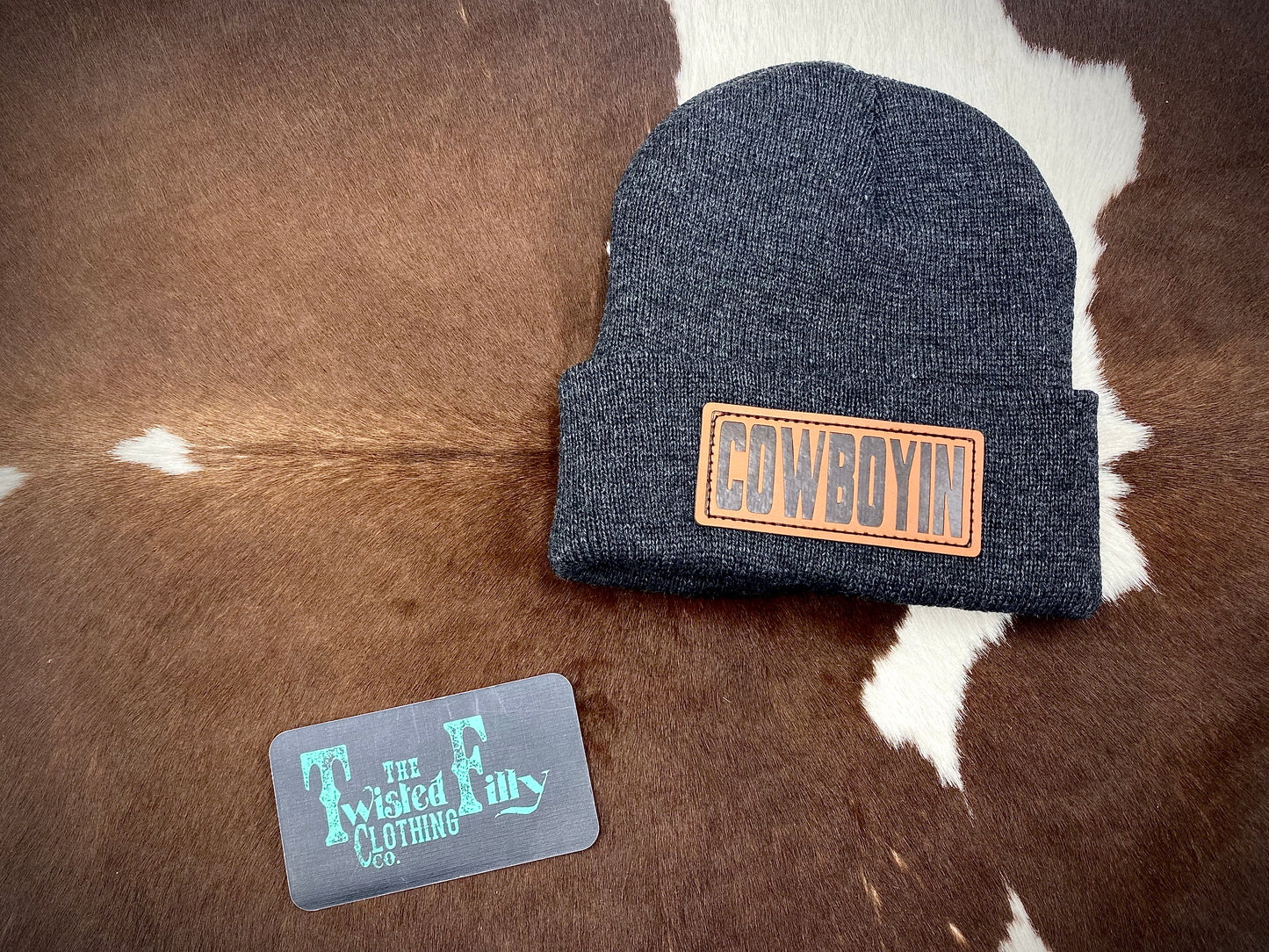 Keep your lid warm with this COWBOYIN' leather patch beanie! Essential gear for the ranch or stylish enough for going out to run errands in town. Great size for infants, toddlers & youth! Also comes in turquoise, heather gray, brown, and crimson.