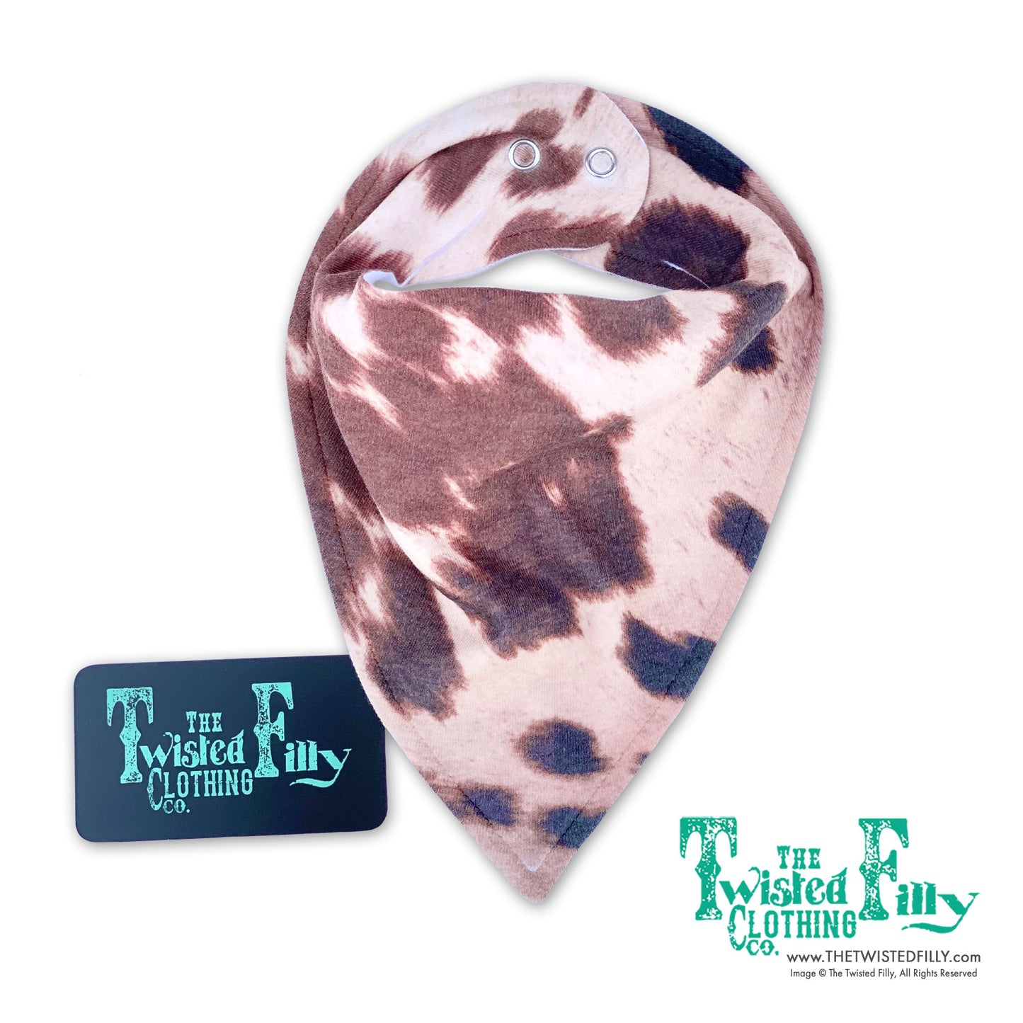 Round up your happy Cowkids stray grub with this one of a kind punchy bandanna style bib. 2 snap adjustable closure for easy and secure use. Our bibs are 65% Poly and 30% Cotton and softer than your Mamma's mashed taters! We know you and your cowboy or cowgirl babe will love this bib!