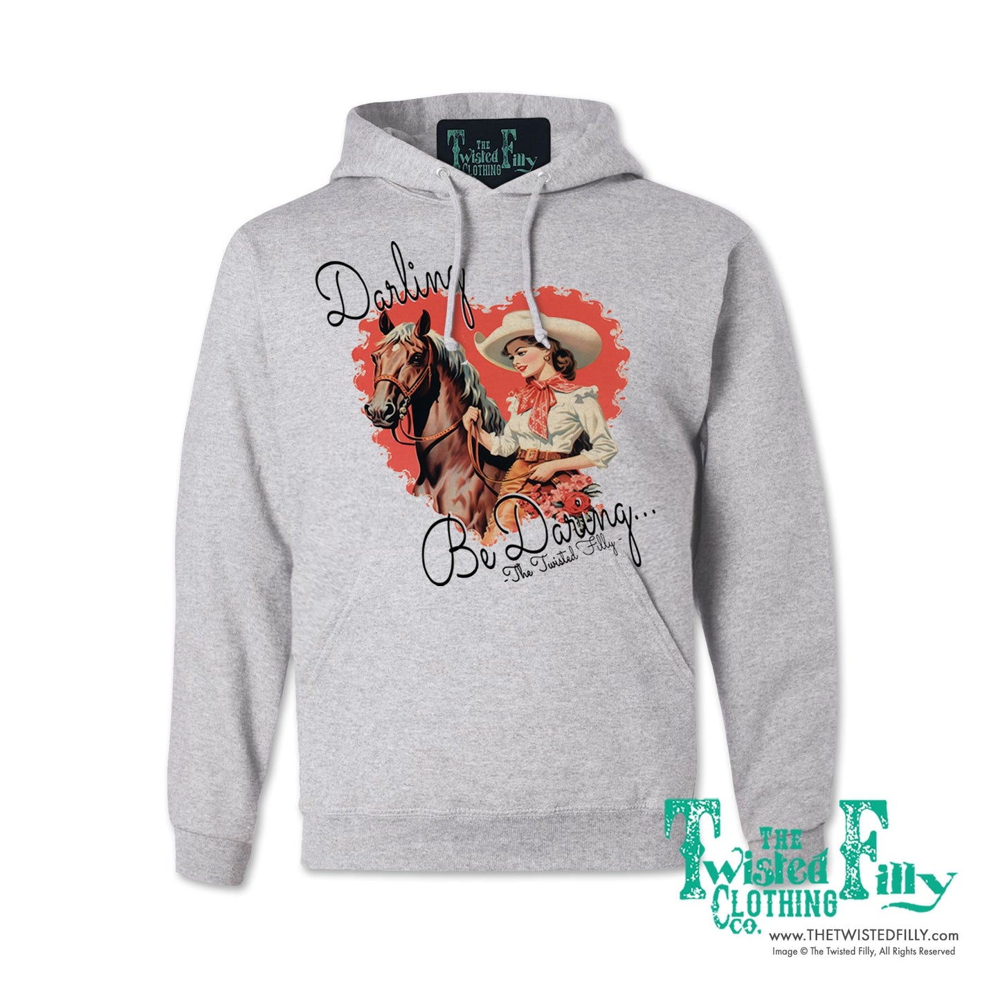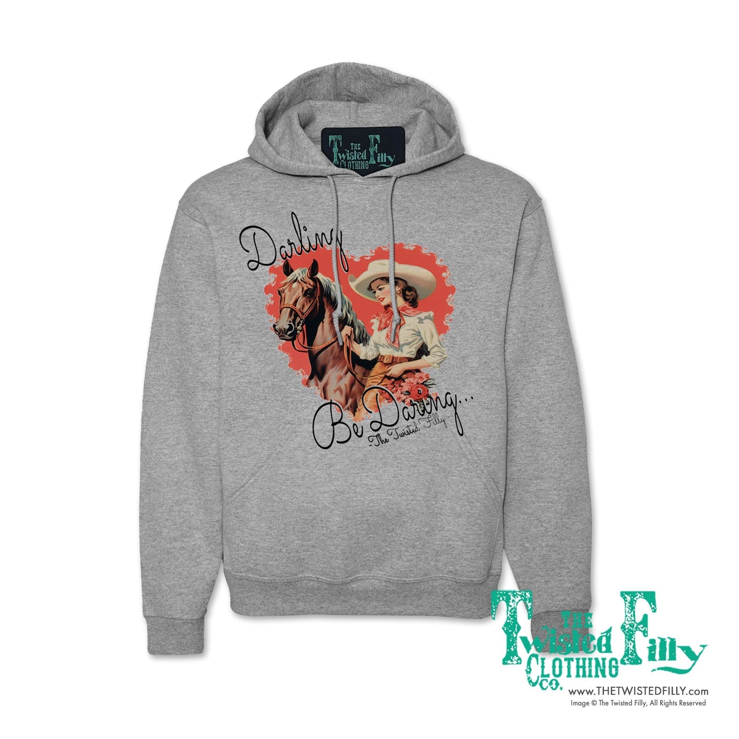 Get ready to unleash your inner daring with this Darling Be Daring womens hoodie. Perfect for Valentine's Day or any day, this hoodie captures a nostalgic western and vintage feel. And the best part? This design is available in Infant, Toddler, and Youth for the Mini Me look!