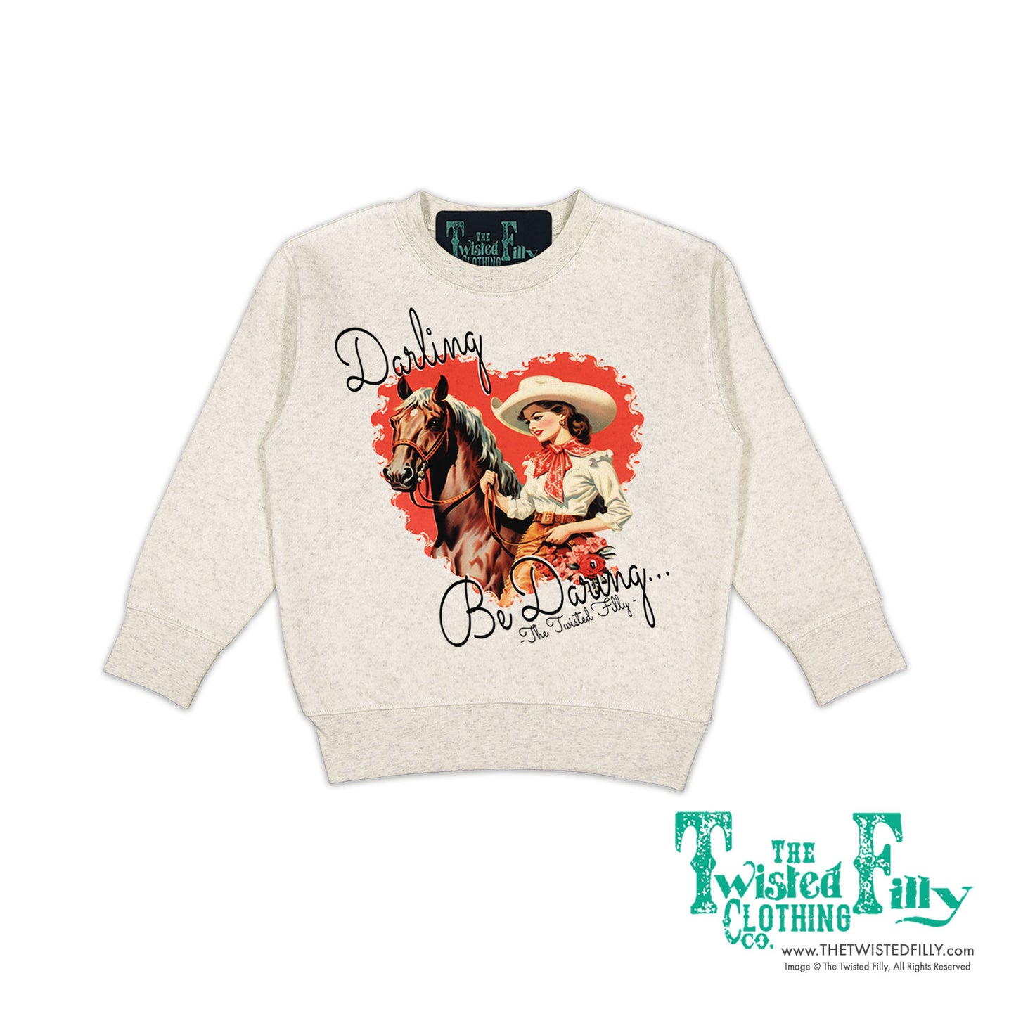 Unleash your inner wild child with this charming Darling Be Daring sweatshirt. Perfect for your little valentine, this vintage-inspired design brings a nostalgic touch to any outfit. Embrace your adventurous side and make a bold fashion statement with this western-inspired sweatshirt. Dare to be different and wear Darling Be Daring!