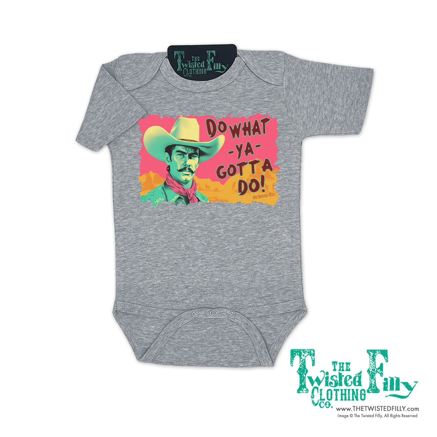 Unleash your little one's spirited side with our Do What Ya Gotta Do infant one piece! Featuring a retro western design and vibrant colors, this outfit is perfect for little cowboys and cowgirls who won't let anything slow them down. Time to saddle up and take on the day!