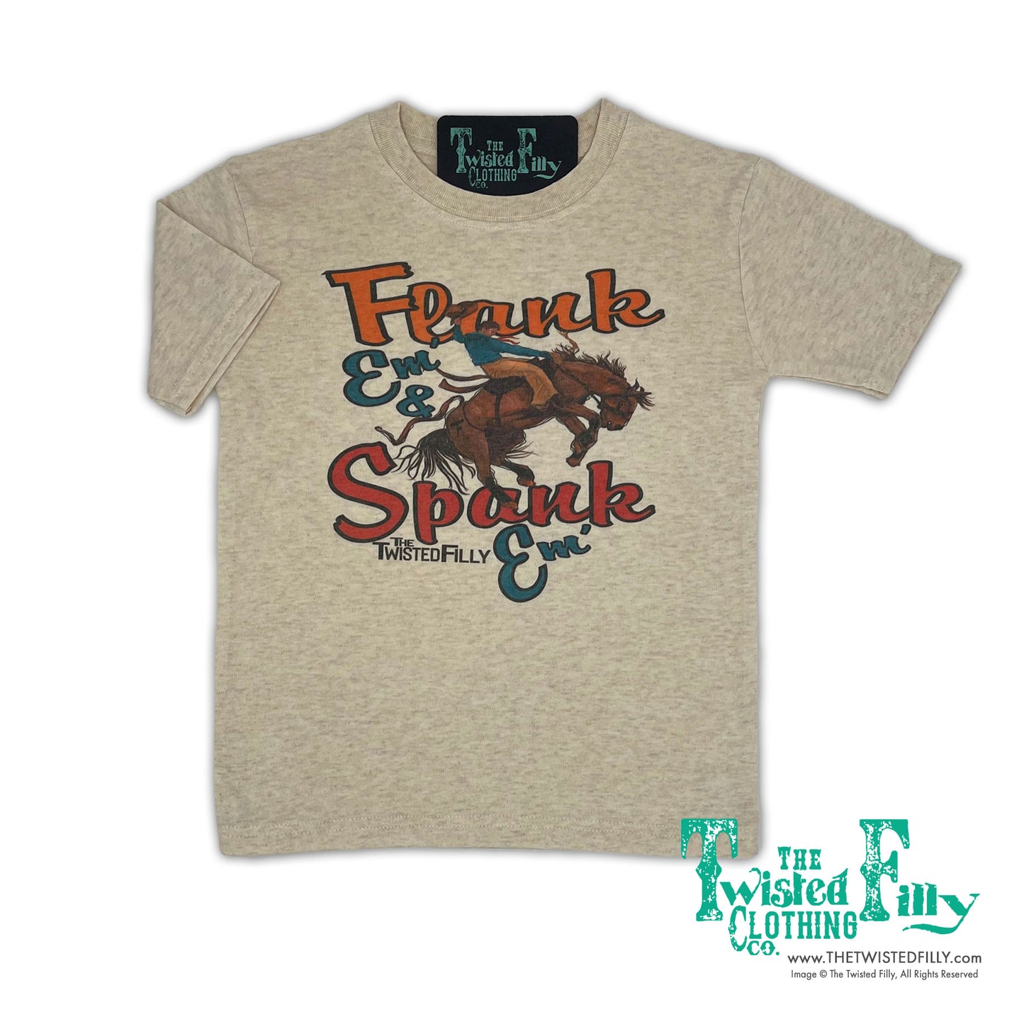 The Twisted Filly Flank Em & Spank Em tee is perfect for any future rough and rowdy cowboy while out on the ranch or cheering mom & dad on at the rodeo. With a vintage style, this shirt features a colorful bronc rider design.