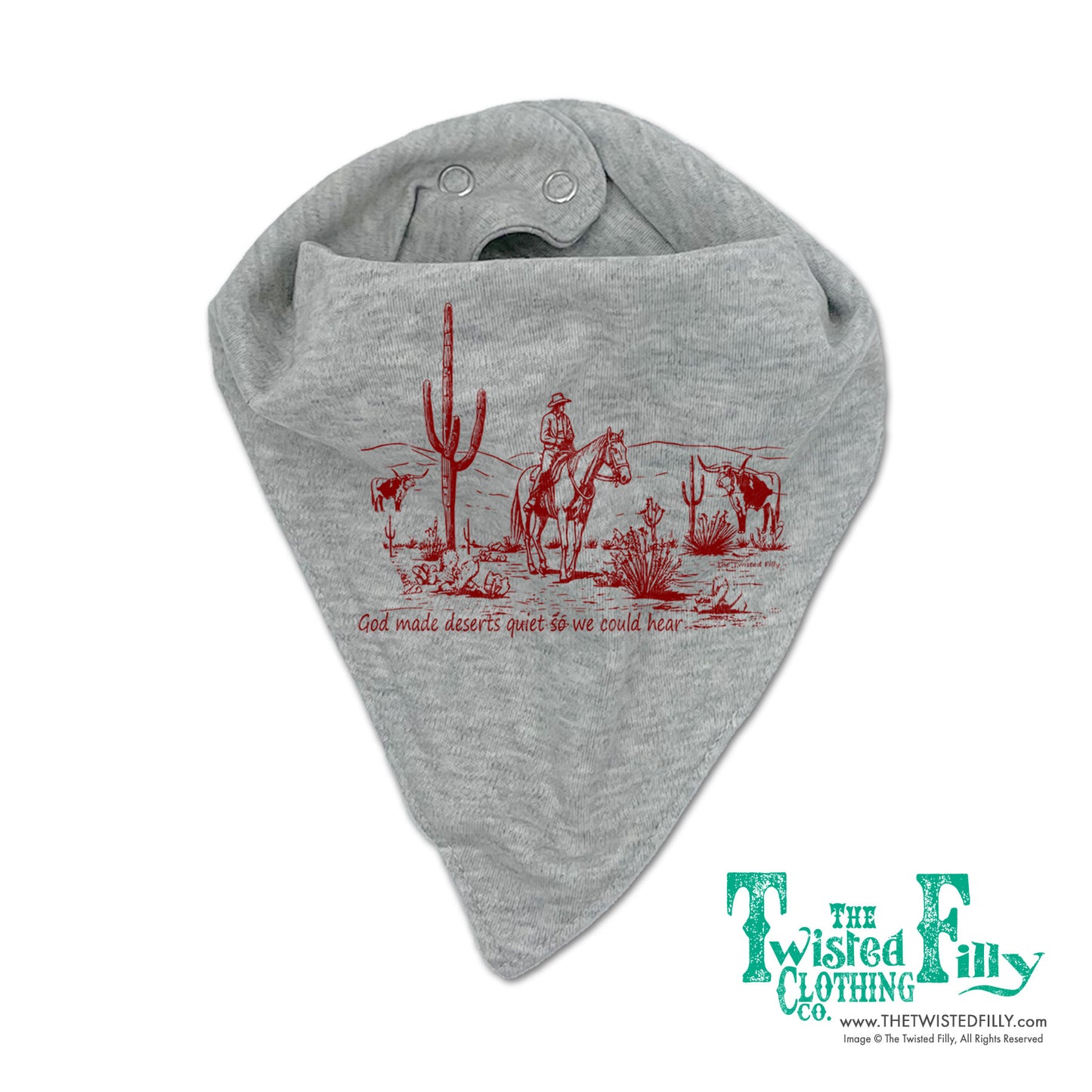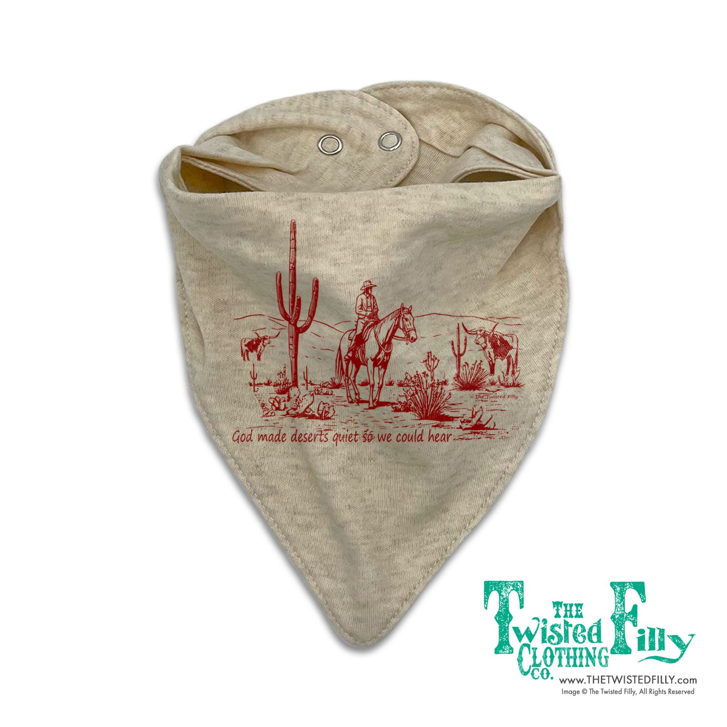 Can you hear it? Wrap your little wranglers in the tranquility of the wild west with our 'God Made Deserts Quiet So We Could Hear' bandana style bib. Experience the peaceful desert serenity of God's creation wherever your young 'uns may roam.