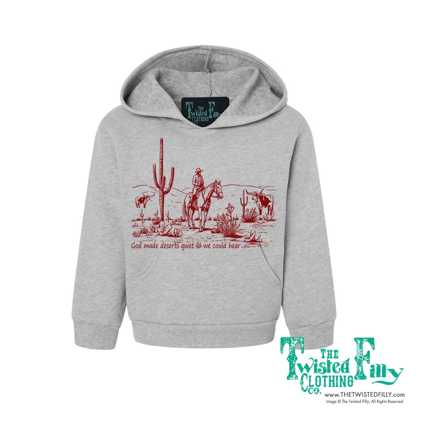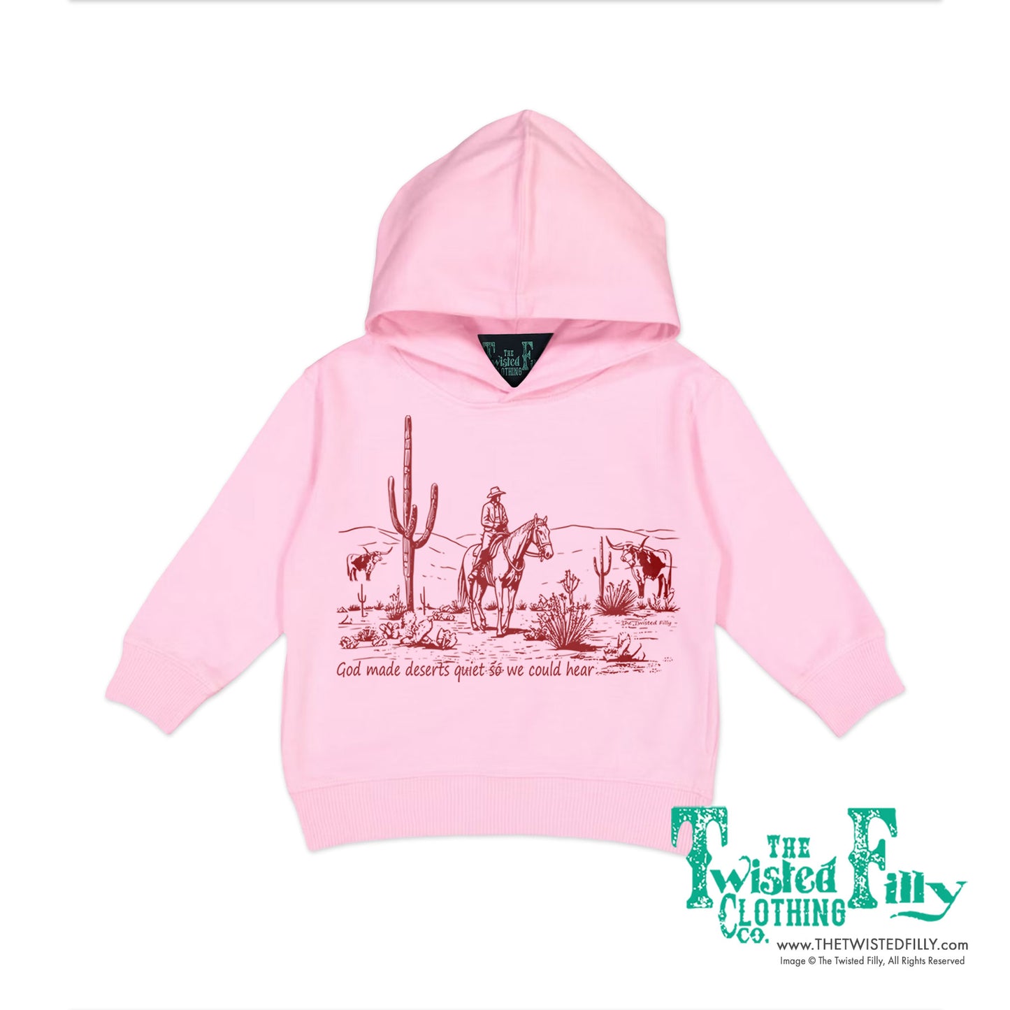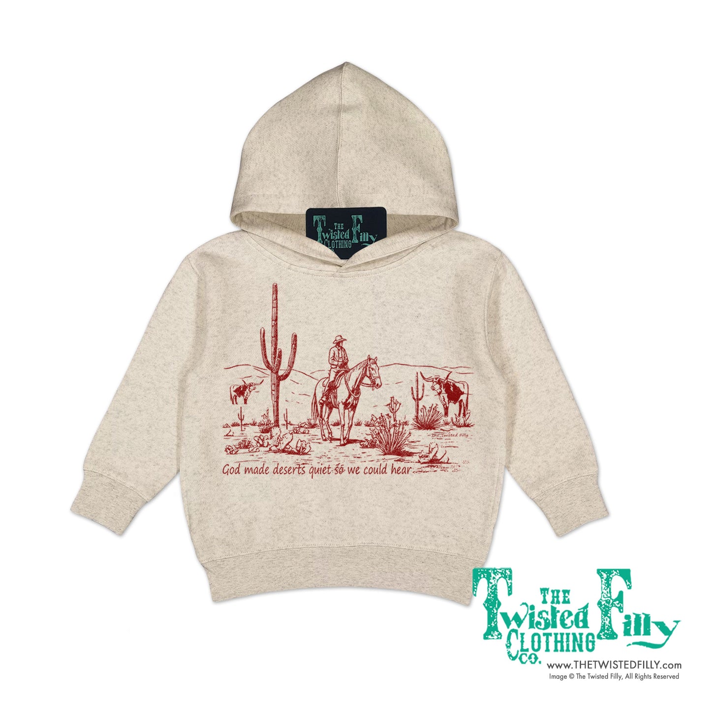 Can you hear it? Wrap your little wranglers in the tranquility of the wild west with our 'God Made Deserts Quiet So We Could Hear' hoodie. Experience the quiet desert serenity of God's creation wherever your young 'uns may roam.