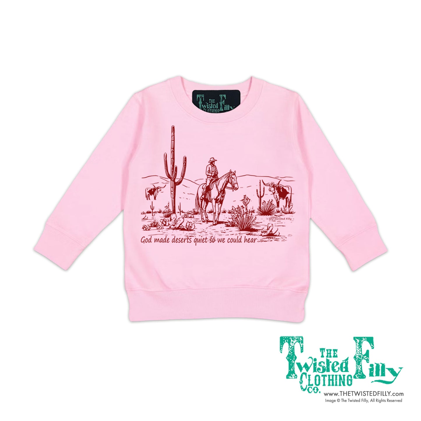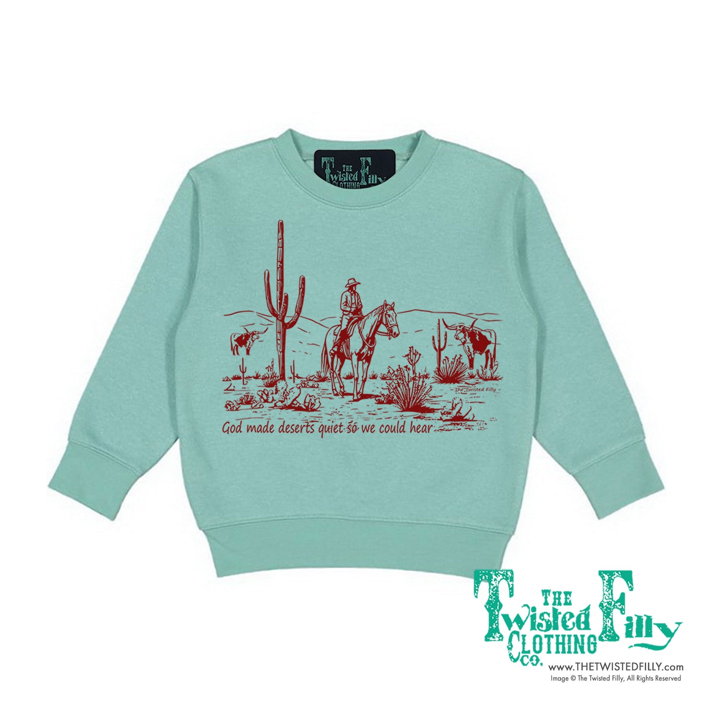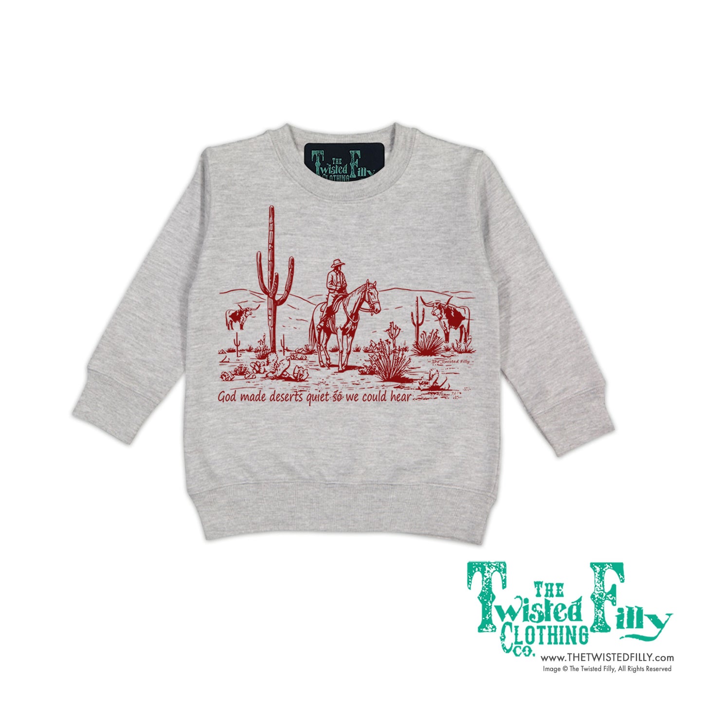 Can you hear it? Wrap your little wranglers in the tranquility of the wild west with our 'God Made Deserts Quiet So We Could Hear' sweatshirt. Experience the quiet desert serenity of God's creation wherever your young 'uns may roam.