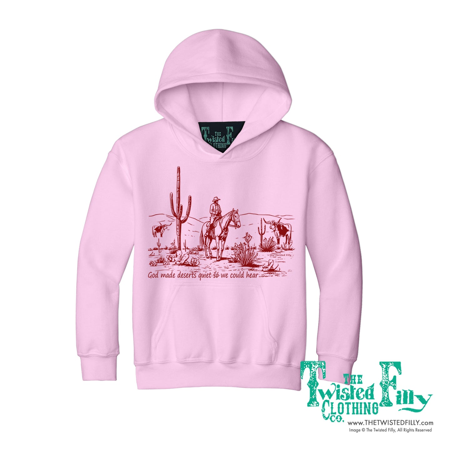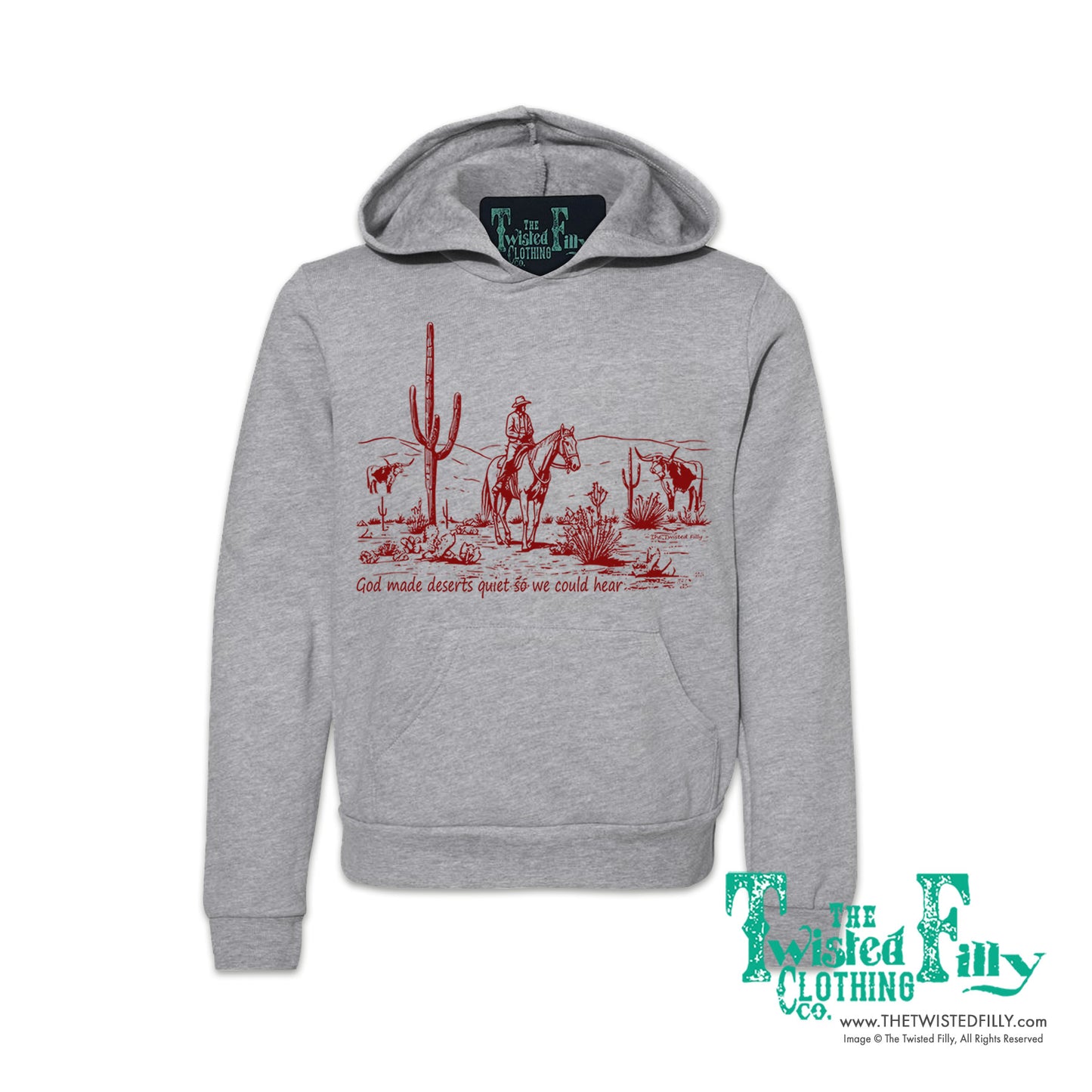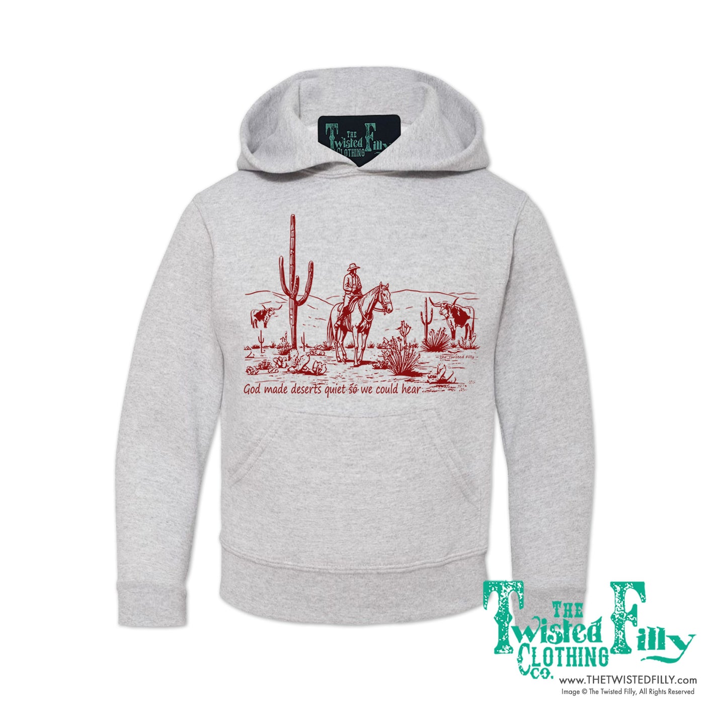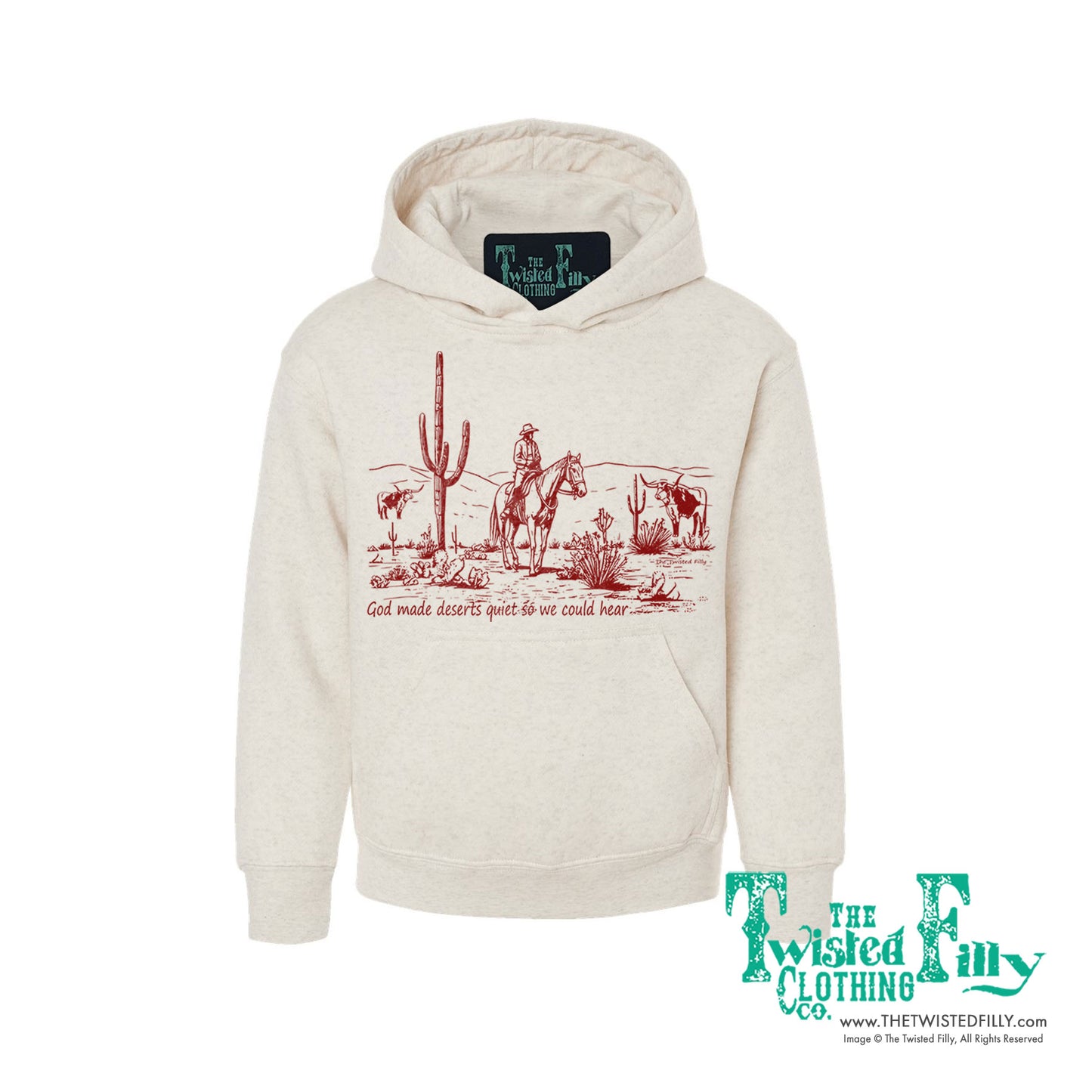 Can you hear it? Wrap your little wranglers in the tranquility of the wild west with our 'God Made Deserts Quiet So We Could Hear' hoodie. Experience the quiet desert serenity of God's creation wherever your young 'uns may roam.