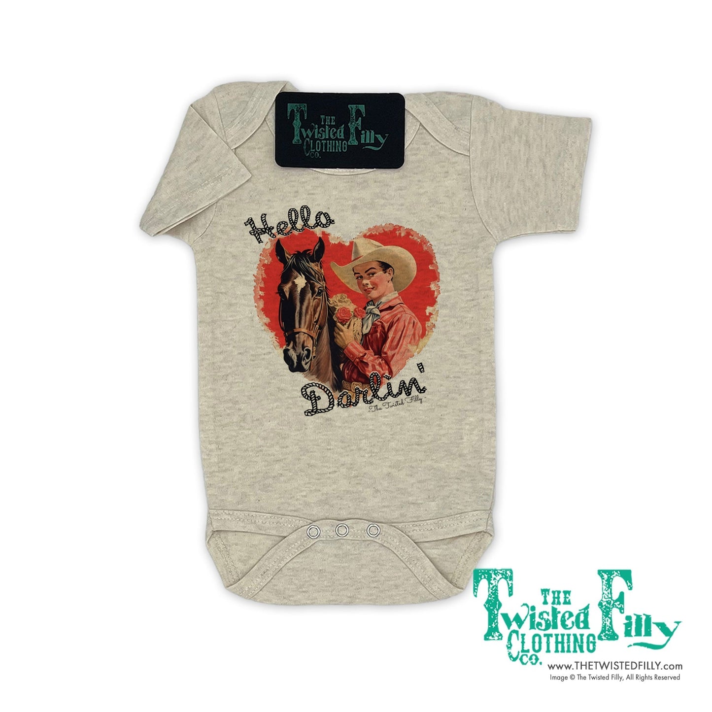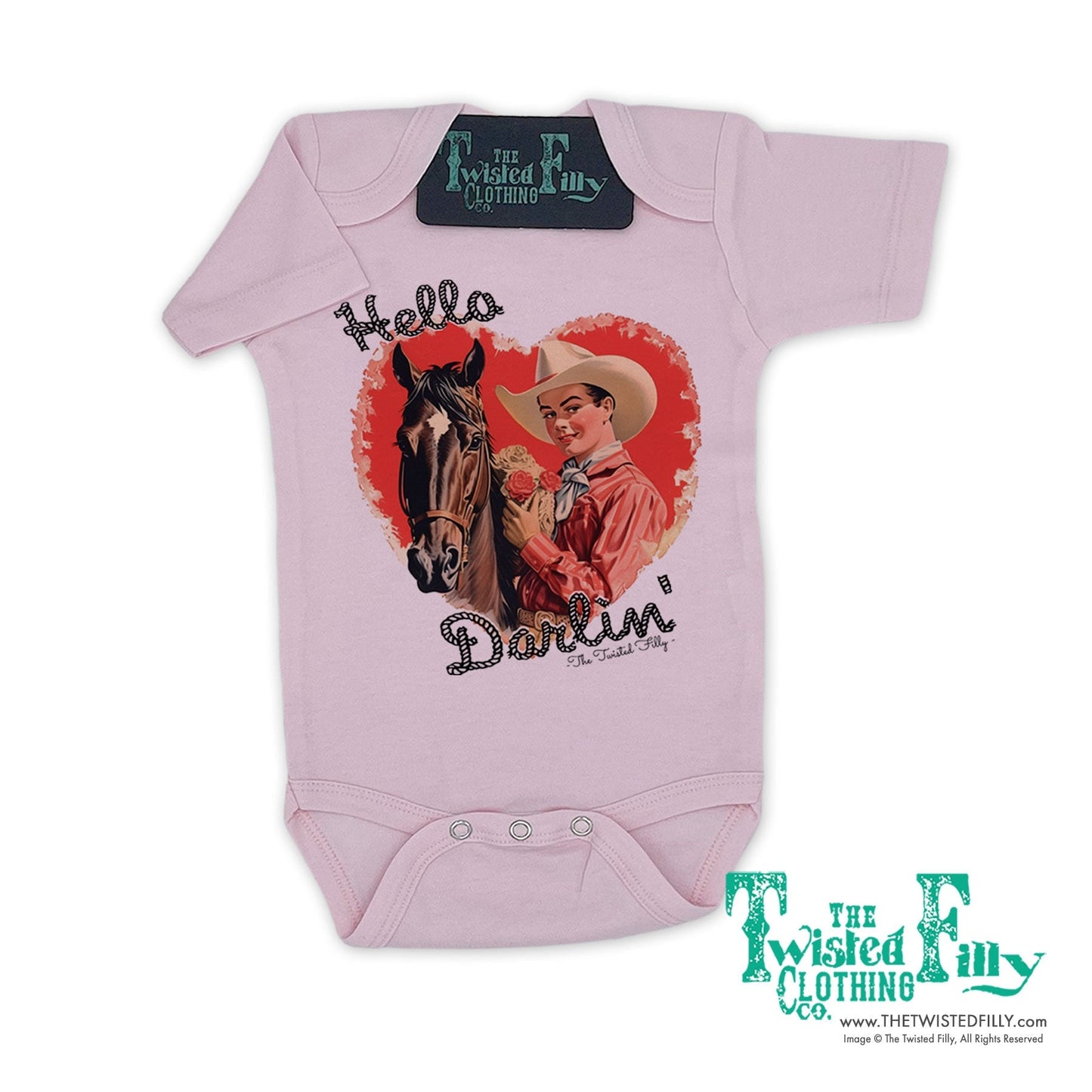 Ride off into the sunset and show off some southern charm with our Hello Darlin' Infant One Piece! This vintage-inspired design evokes feelings of old-time cowboy nostalgia. Perfect for every cowkid. Spread the love this Valentine's with a touch of western charm!
