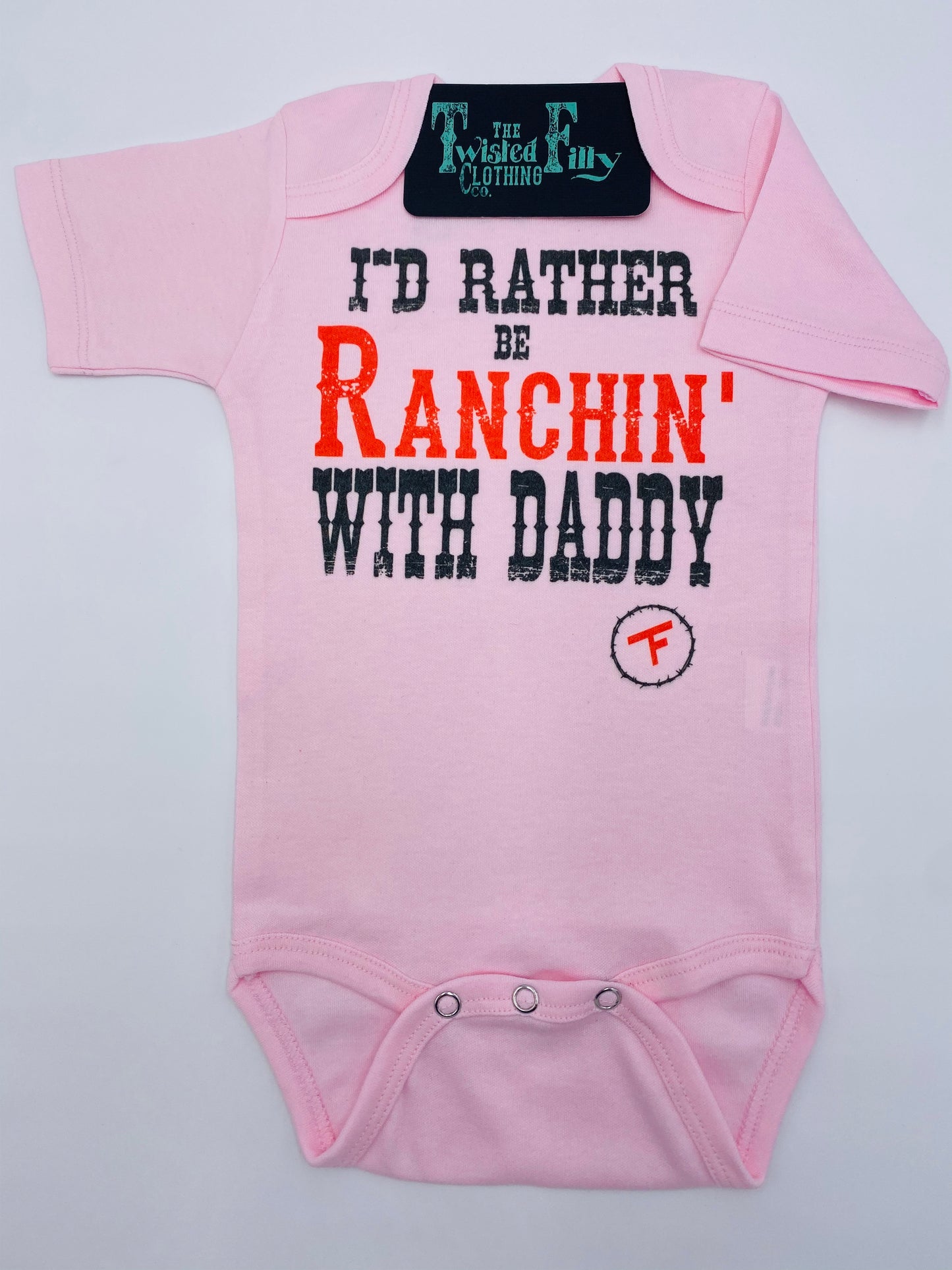 I'd Rather Be Ranchin' with Daddy! He is the best ranch partner. This infant one piece is a great way for kids to show their appreciation for hard working Ranch Dads. Show him that you are with him through it all with this cute one piece outfit!