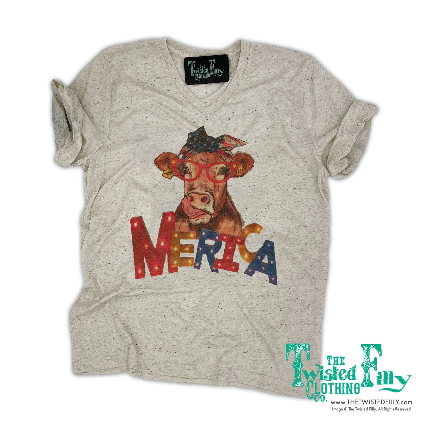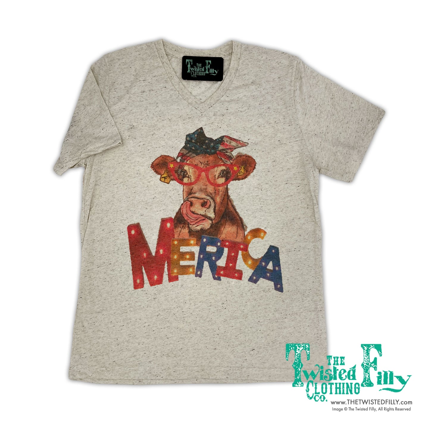 Merica Cow - S/S Womens Adult V-Neck Tee - Oatmeal
