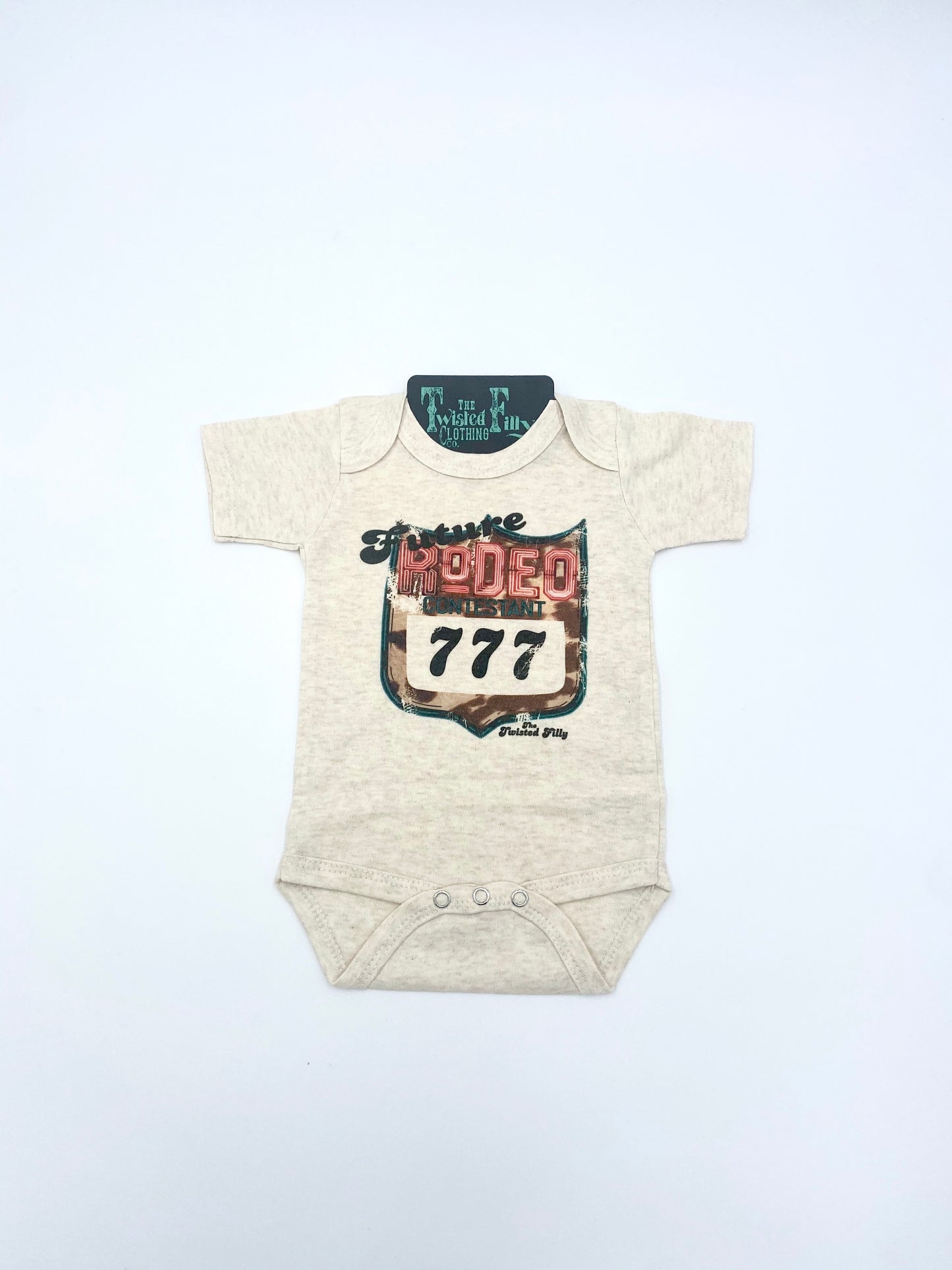 You'll want to get your little cowboy or cowgirl ready for the rodeo with this adorable one piece infant outfit. This outfit features a rodeo back number with the lucky number 777, and "Future Rodeo Contestant". This one piece outfit is perfect for a day of watching the rodeo, or just playing around in the backyard.