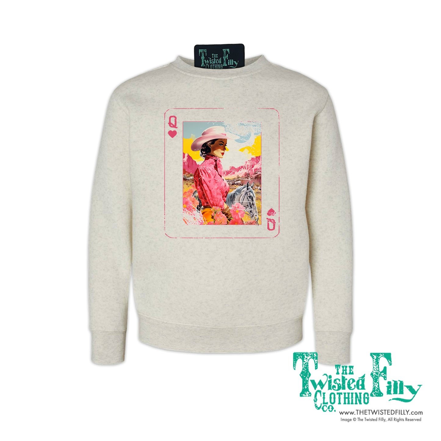 Make your little cowgirl the Queen Of Hearts this Valentine's Day with our super cute sweatshirt. A royal flush of vintage charm mixed with a touch of cowgirl flair, this sweatshirts perfect for any little cowgirl. Don't gamble on love, choose our Queen Of Hearts sweatshirt!