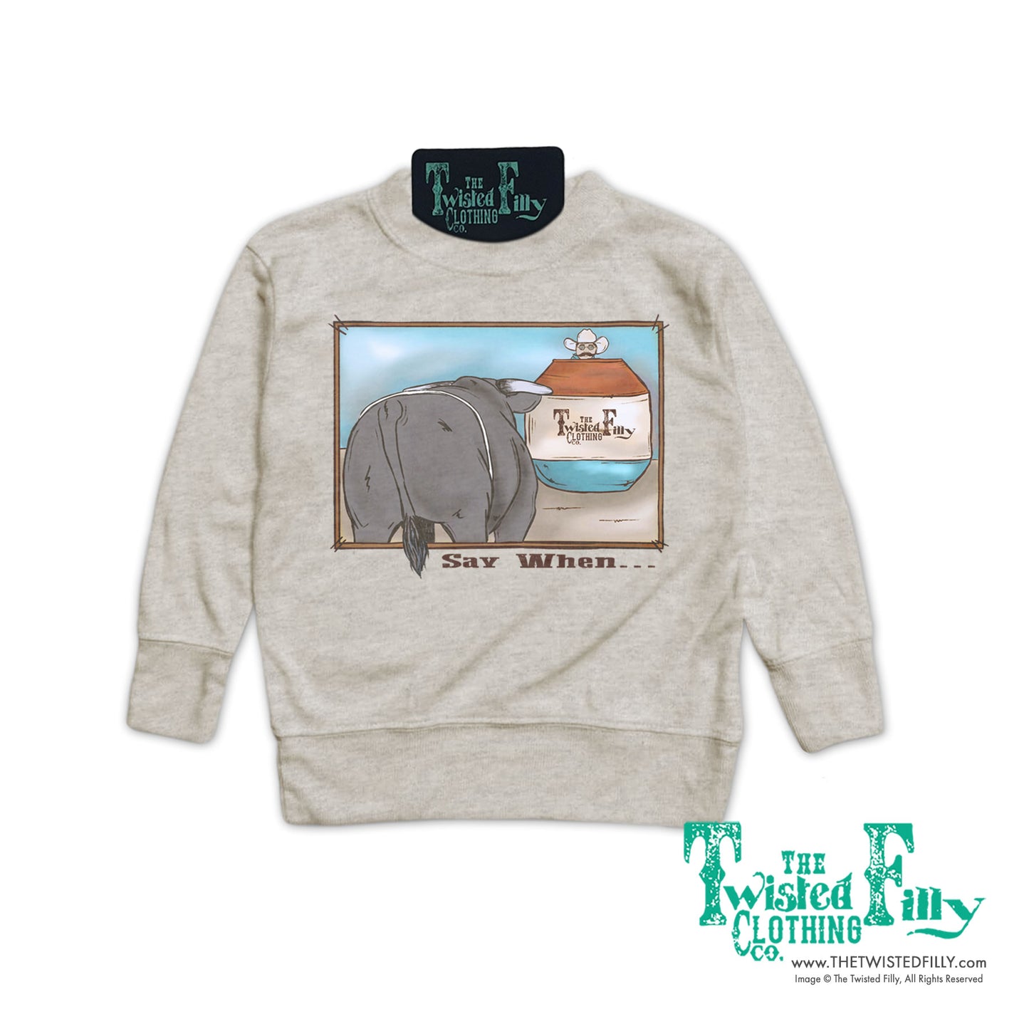 Your mama didn't raise no sissy. Dare to be daring and brave the world - Say When! The stylish design features a fun rodeo bull and clown, taunting each other in the rodeo arena. Life is a rodeo, so embrace the challenge and take on the world with this Say When design!