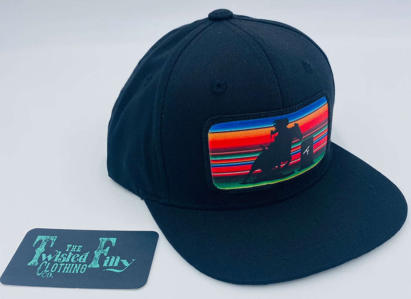 Little girls are loving this cap, showing off their event. This serape Barrel Racer black flat bill snap back cap pairs nicely with just about any outfit.