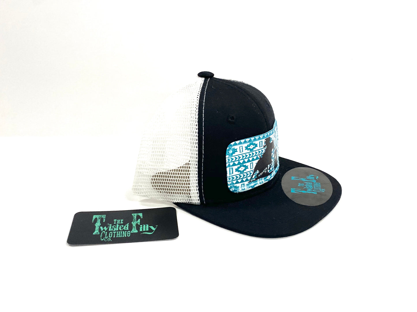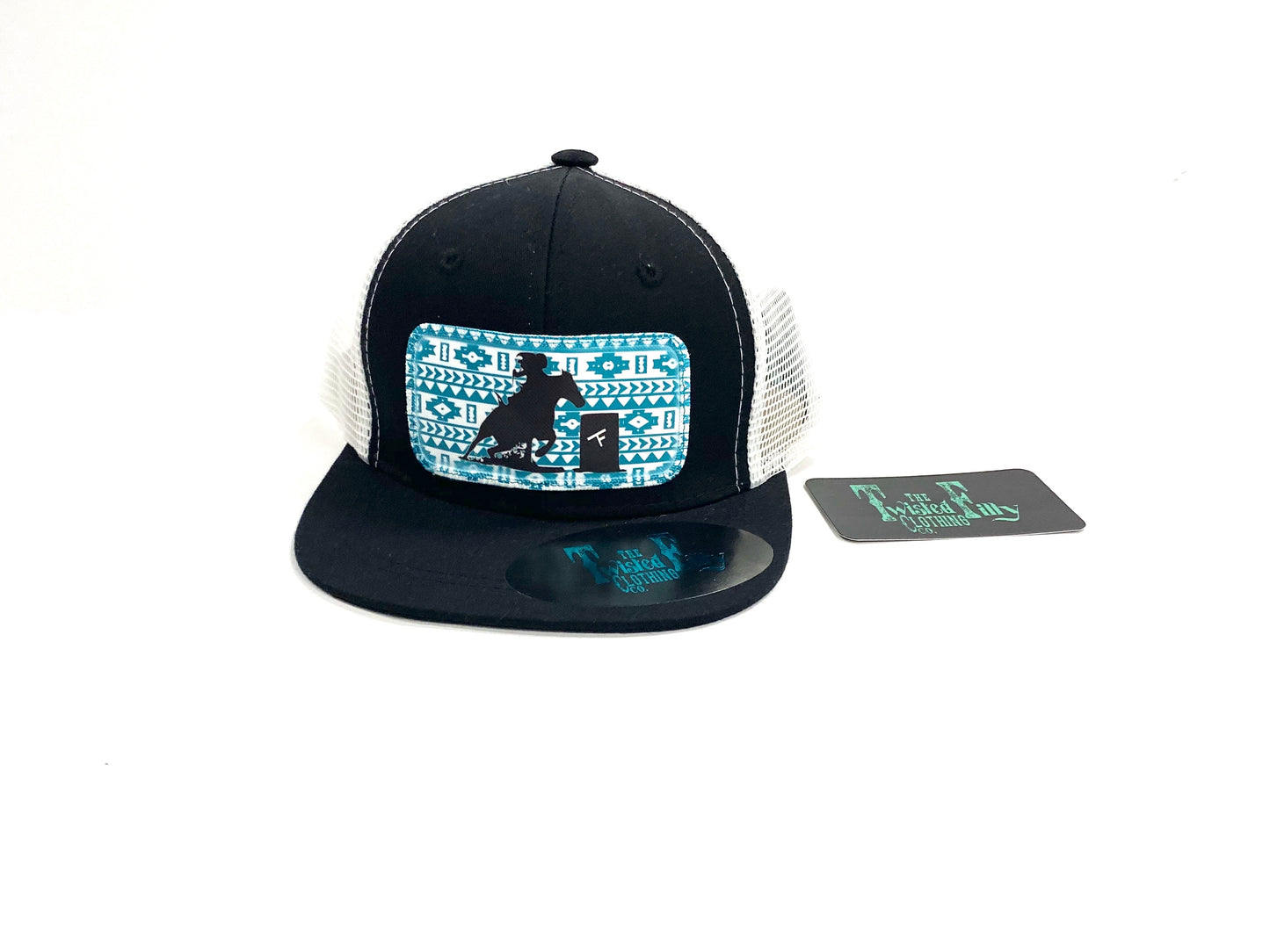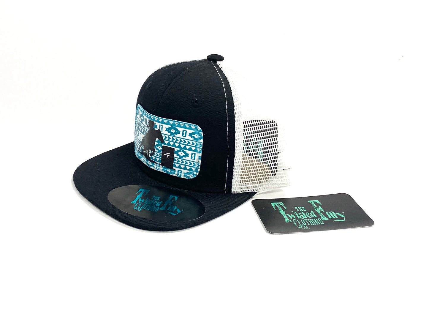 Your going to absolutely adore our new Southwest hat line, every rodeo event offered with exquisite detail to style and quality. We know that your future Barrel Racing champ will rock this hat and get compliments everywhere they go. Black and white trucker with snap back closure.
