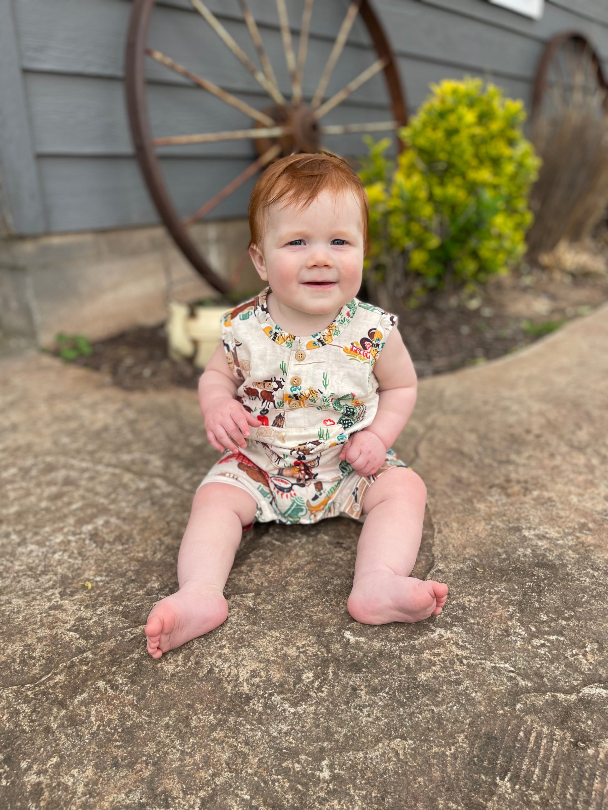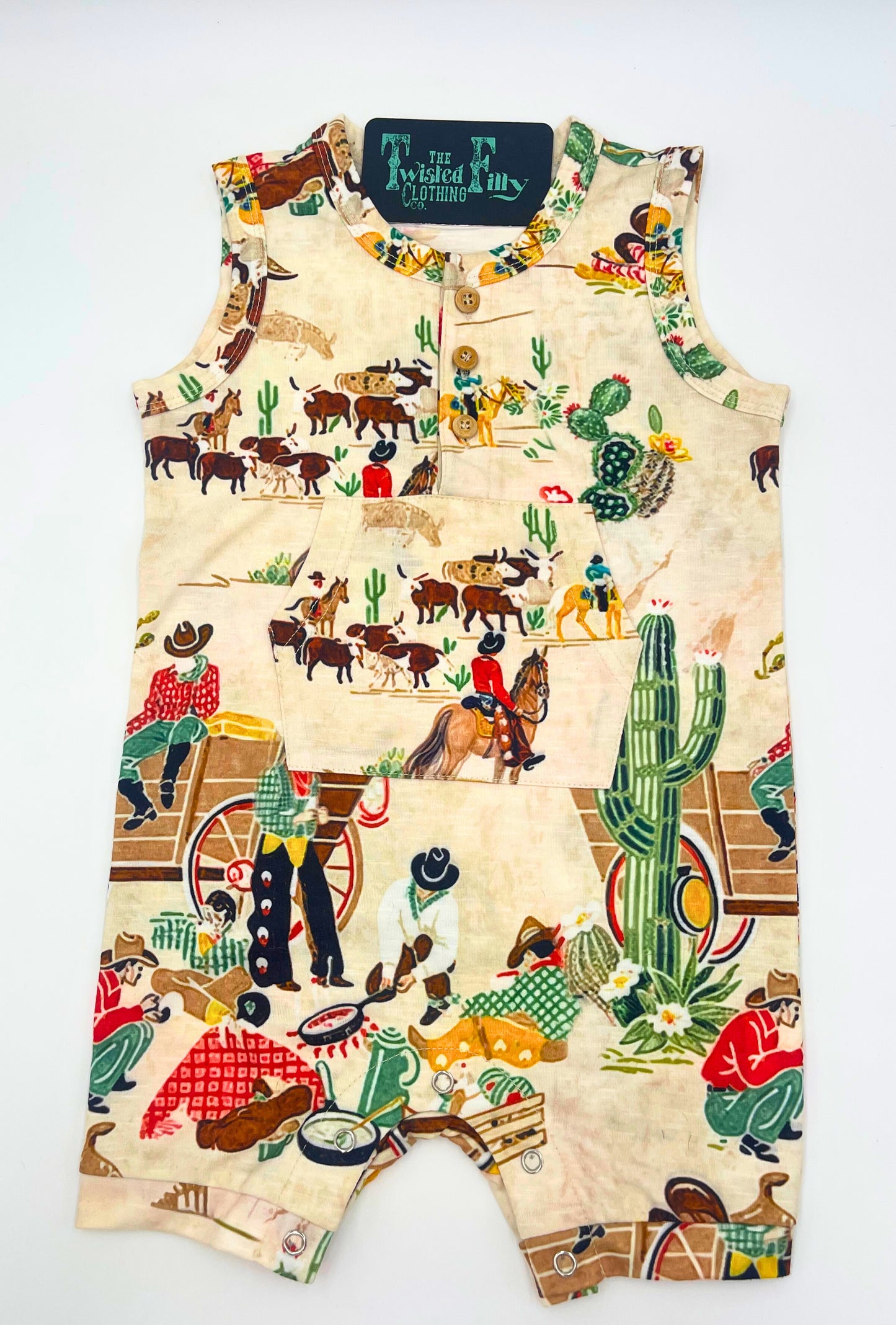 This taupe sleeveless romper blends cool cowboy style with all-day comfort for your little one. Perfect for adventurous infants, it offers easy movement and a bold look that stands out.