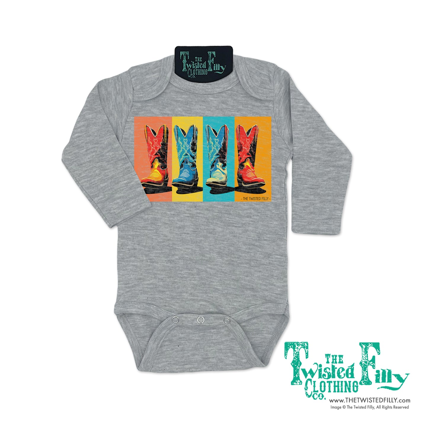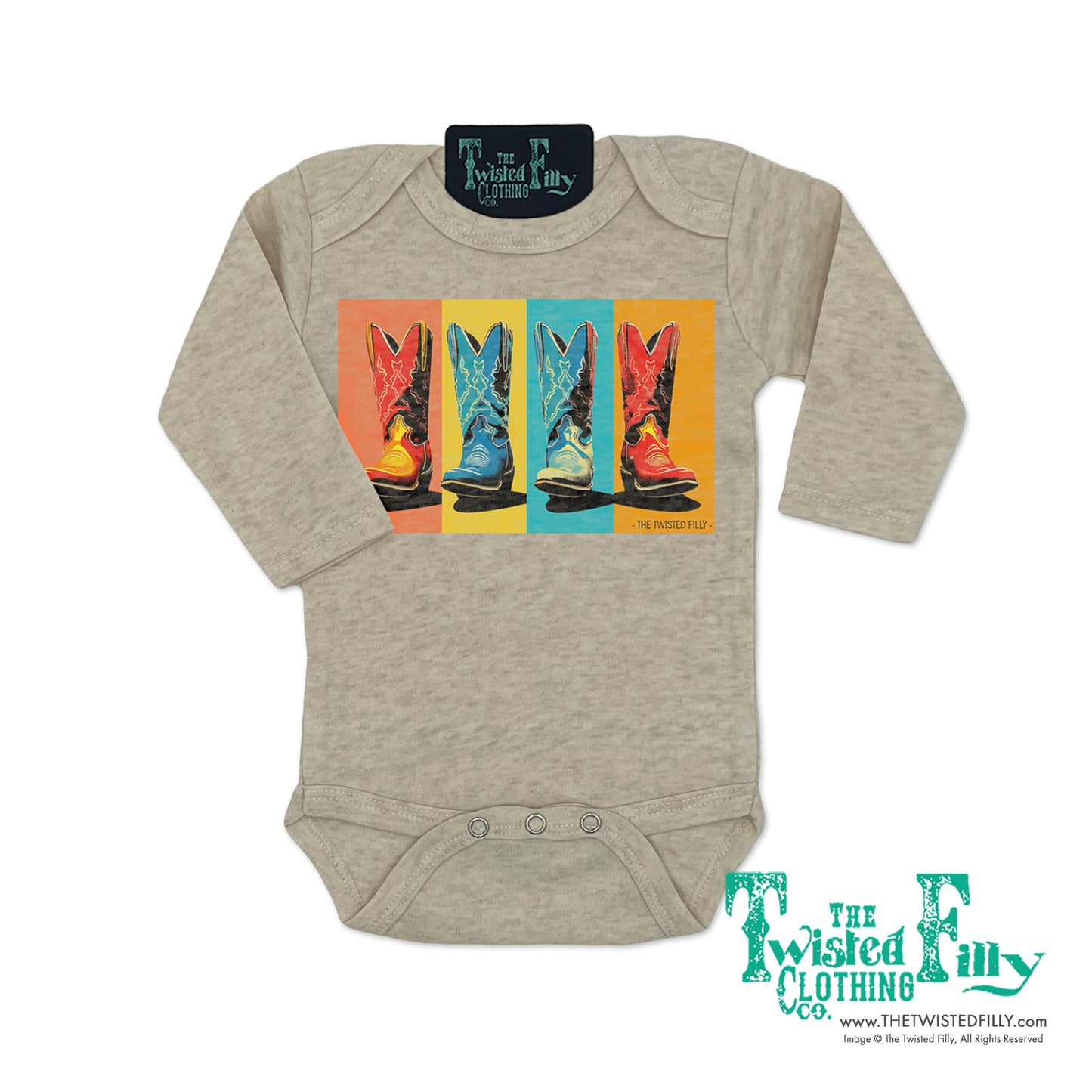 Step into western style with "The Boots" one piece! This retro tee features a colorful design showcasing iconic western boots. Available in assorted colors, this one piece is perfect for any young cowboy or cowgirl looking to fill some big rodeo boots!