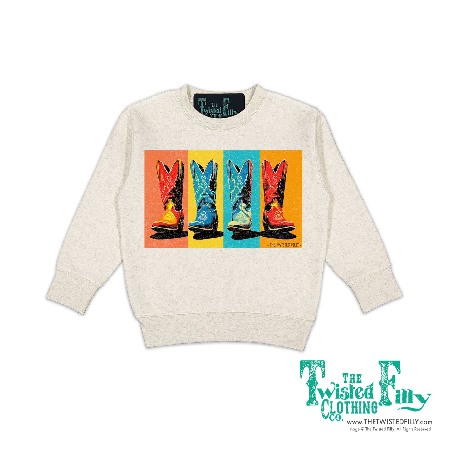 Step into western style with "The Boots" sweatshirt! This retro sweatshirt features a colorful design showcasing iconic western boots. This sweatshirt is perfect for any young cowboy or cowgirl looking to fill some big rodeo boots!