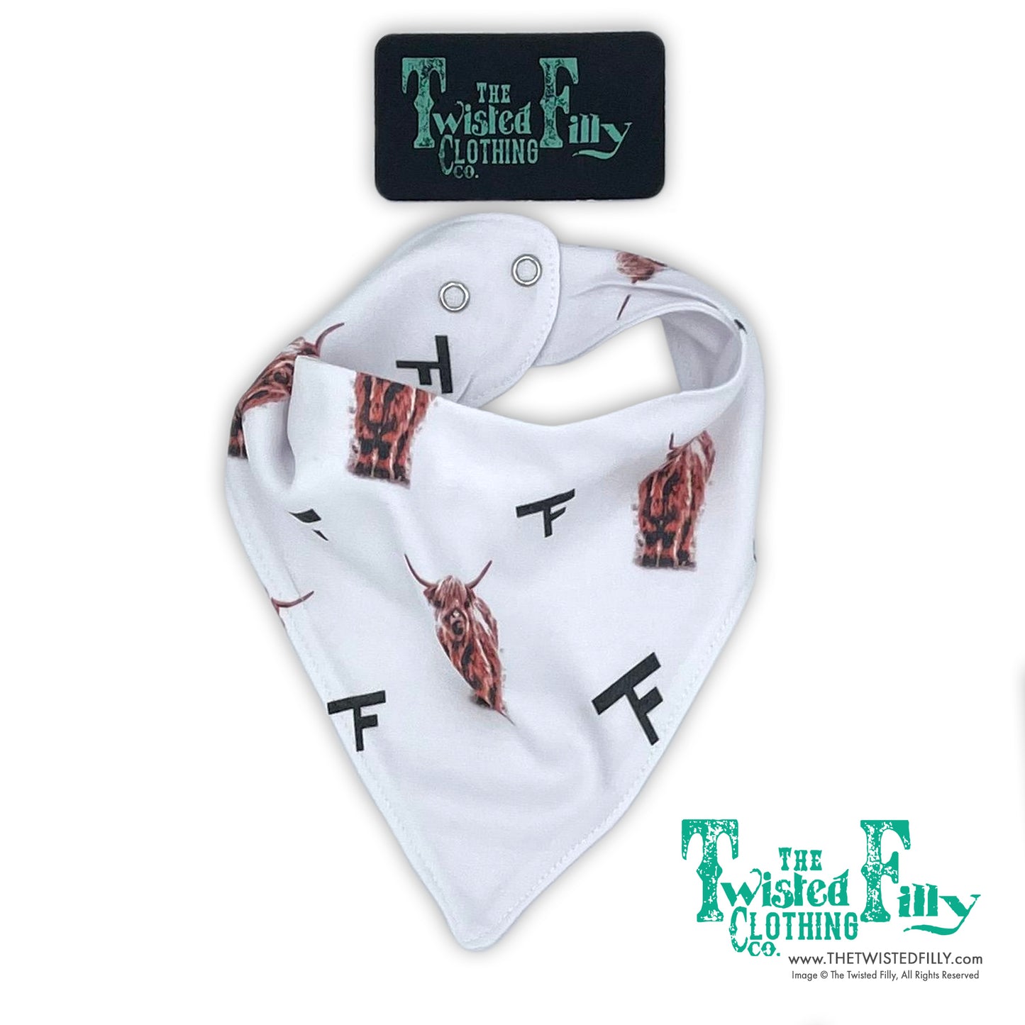 Round up your happy Cowkids stray grub with this one of a kind punchy bandanna style bib. 2 snap adjustable closure for easy and secure use. Our bibs are 65% Poly and 30% Cotton and softer than your Mamma's mashed taters! We know you and your cowboy or cowgirl babe will love this bib!