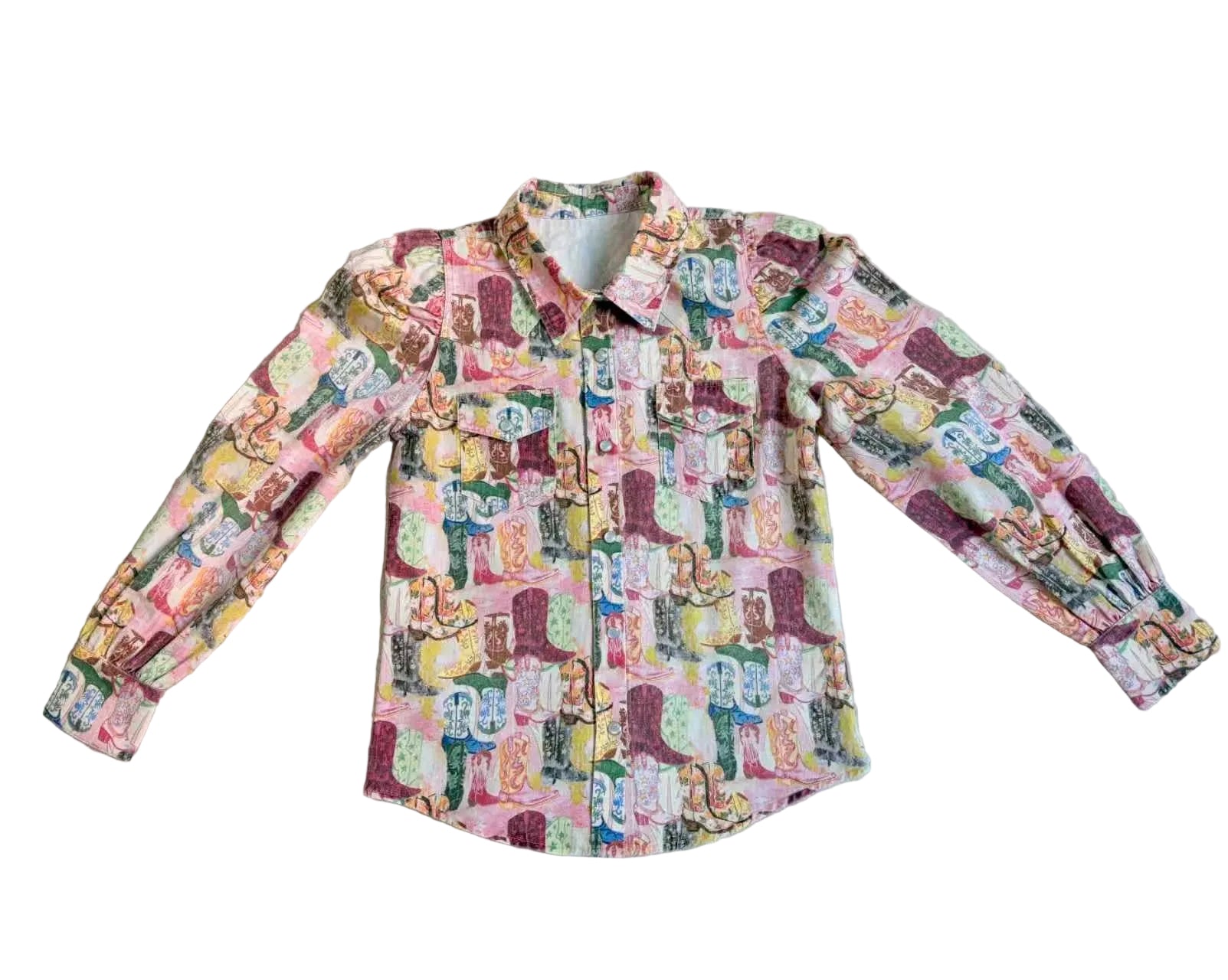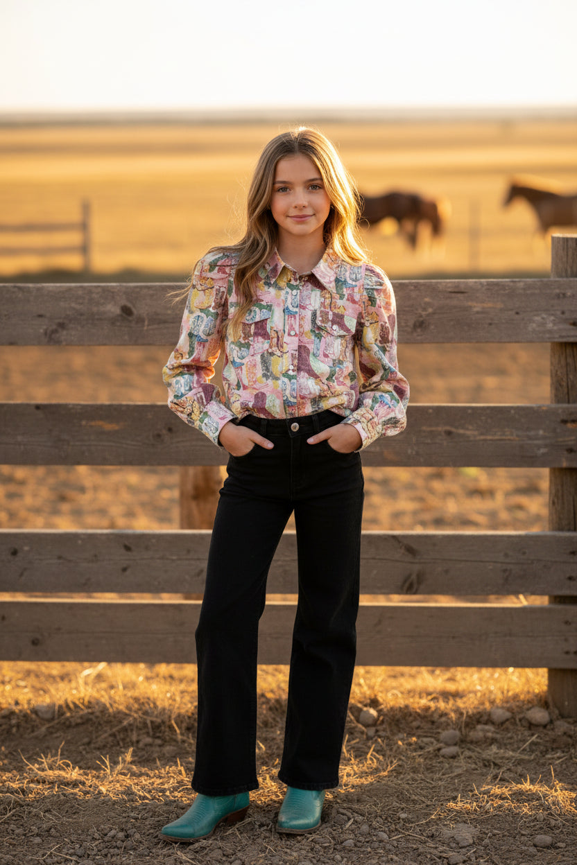 This vintage-inspired denim shirt brings timeless Western style to your little one's wardrobe. Featuring a charming printed design and soft pearl snap closures, it's perfect for ranch days or casual outings. The classic vintage wash adds authentic character while remaining easy to care for. Available in both toddler and youth sizes, this versatile piece pairs effortlessly with jeans or skirts for a look that's both playful and polished.