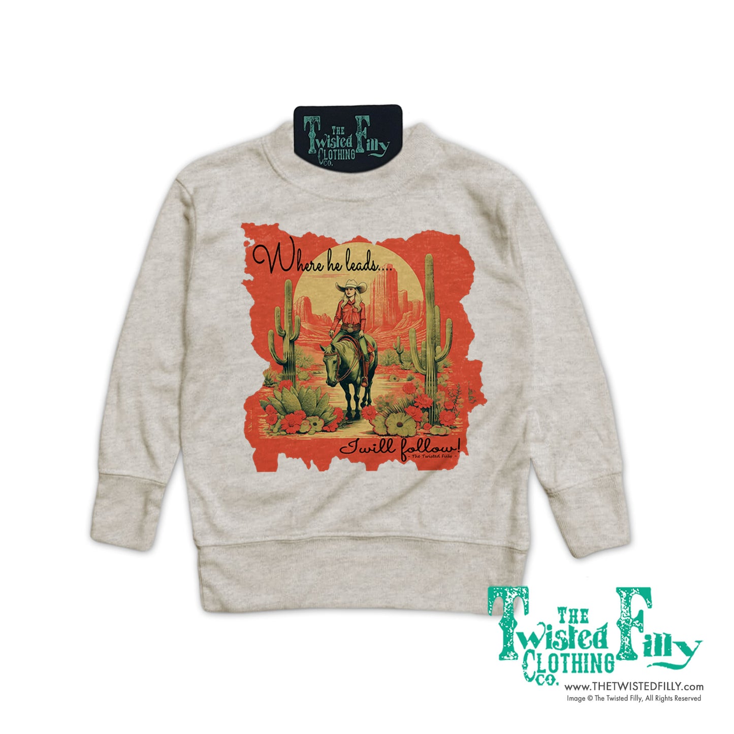 Follow in style with the "Where He Leads, I Will Follow" pullover! Featuring a retro vintage design with a cowgirl on a horse and a desert sunset backdrop, this girls pullover is not only adorable, but also a reminder that God leads us in all walks of life. Keep your little one in style while embracing the faith.