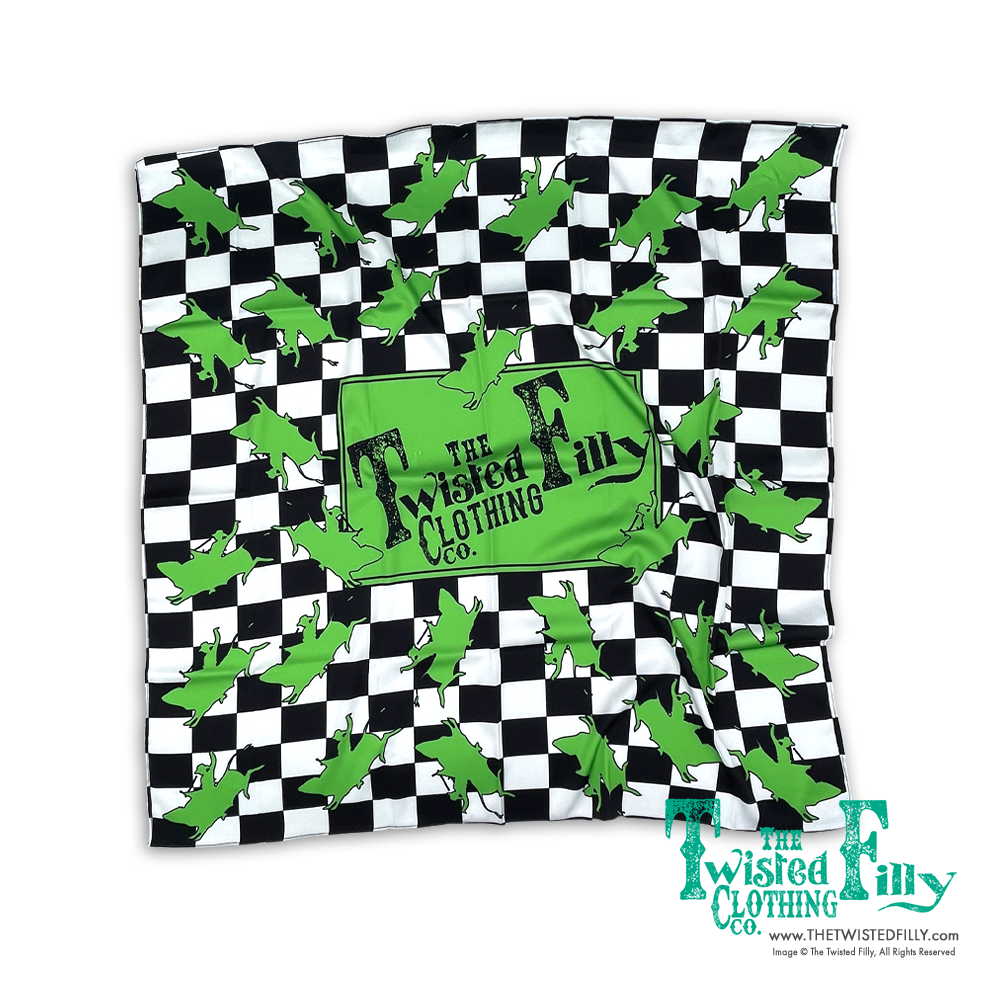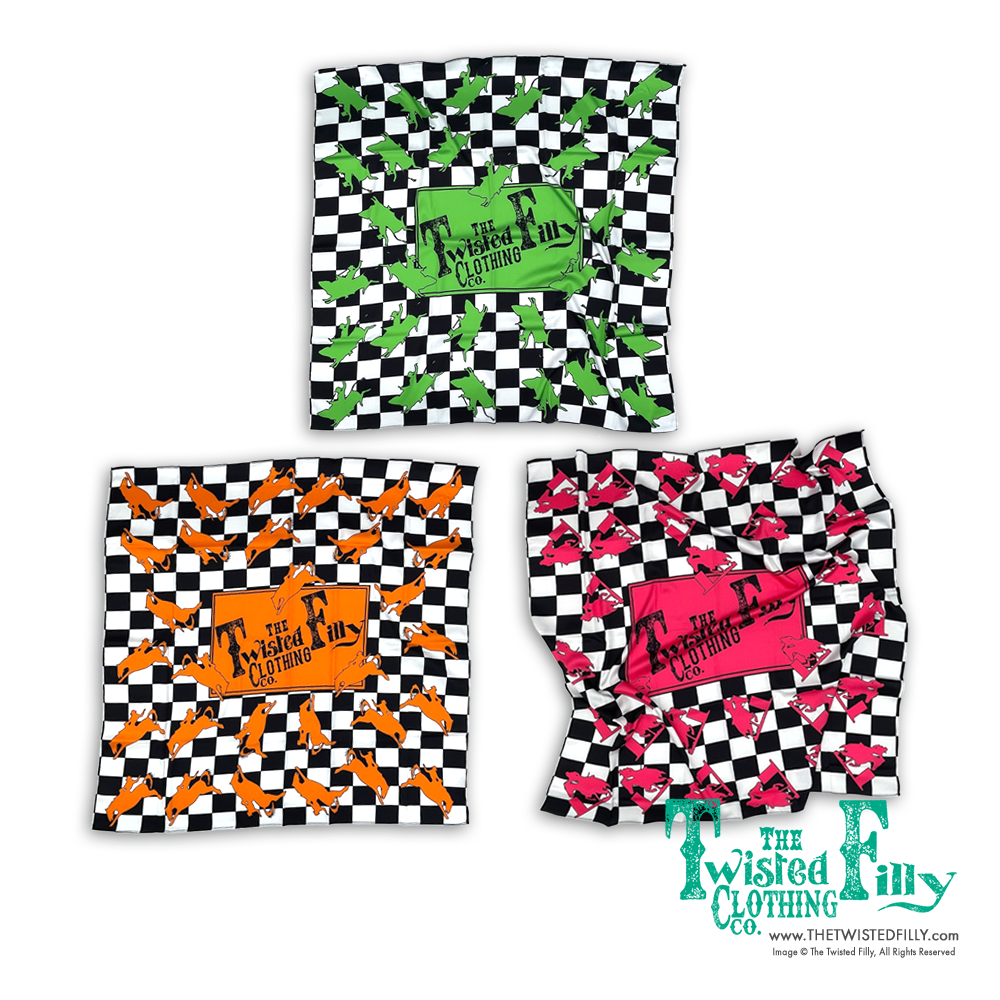 Introducing our stunning collection of Western Checkered Neon Rodeo Wild Rags – the ultimate accessory for any cowboy or cowgirl looking to add a touch of authentic style to their outfit. Crafted from luxurious silk charmeuse and adorned with checkered neon green bull riders, neon orange bronc riders, and neon pink barrel racers, these wild rags are as functional as they are fashionable.