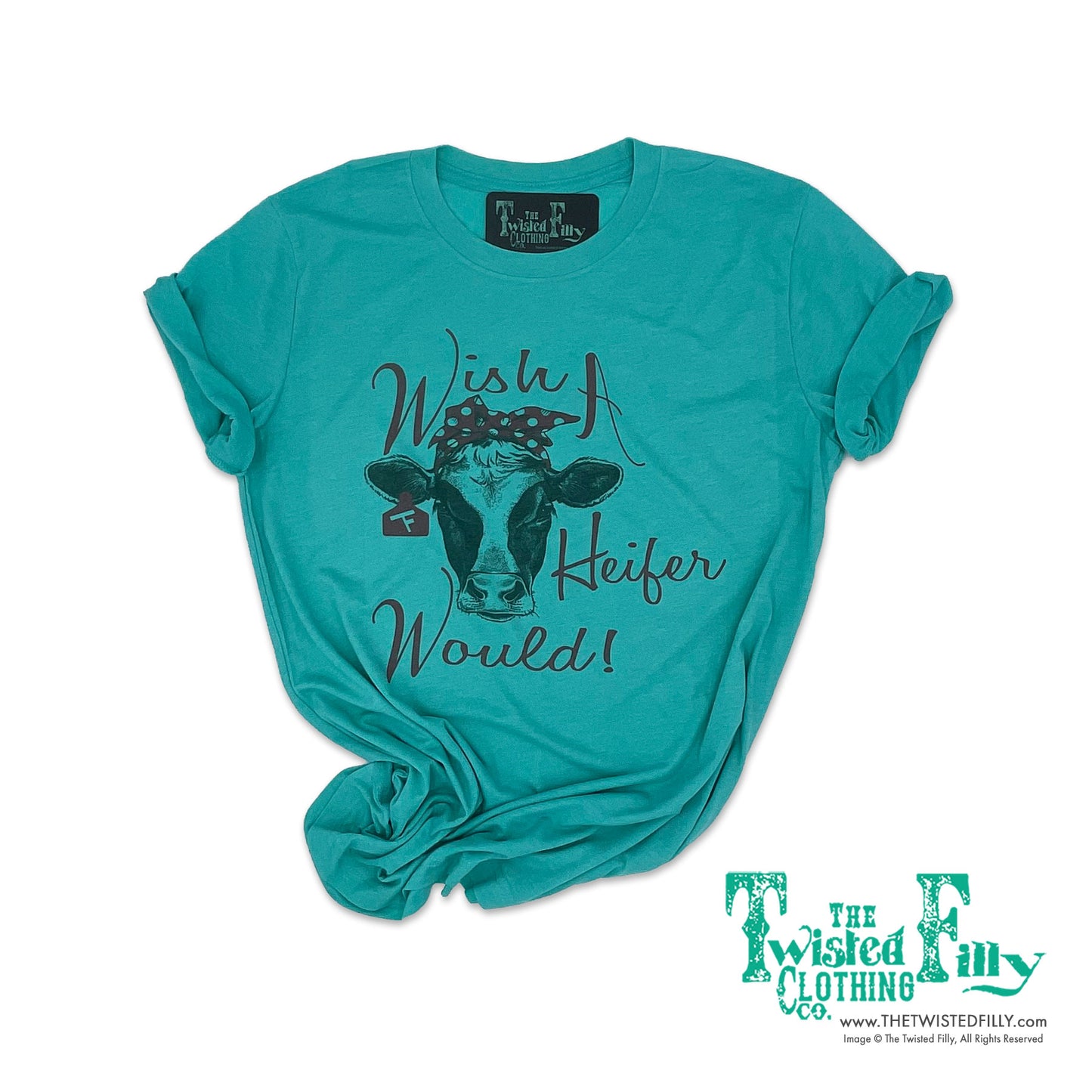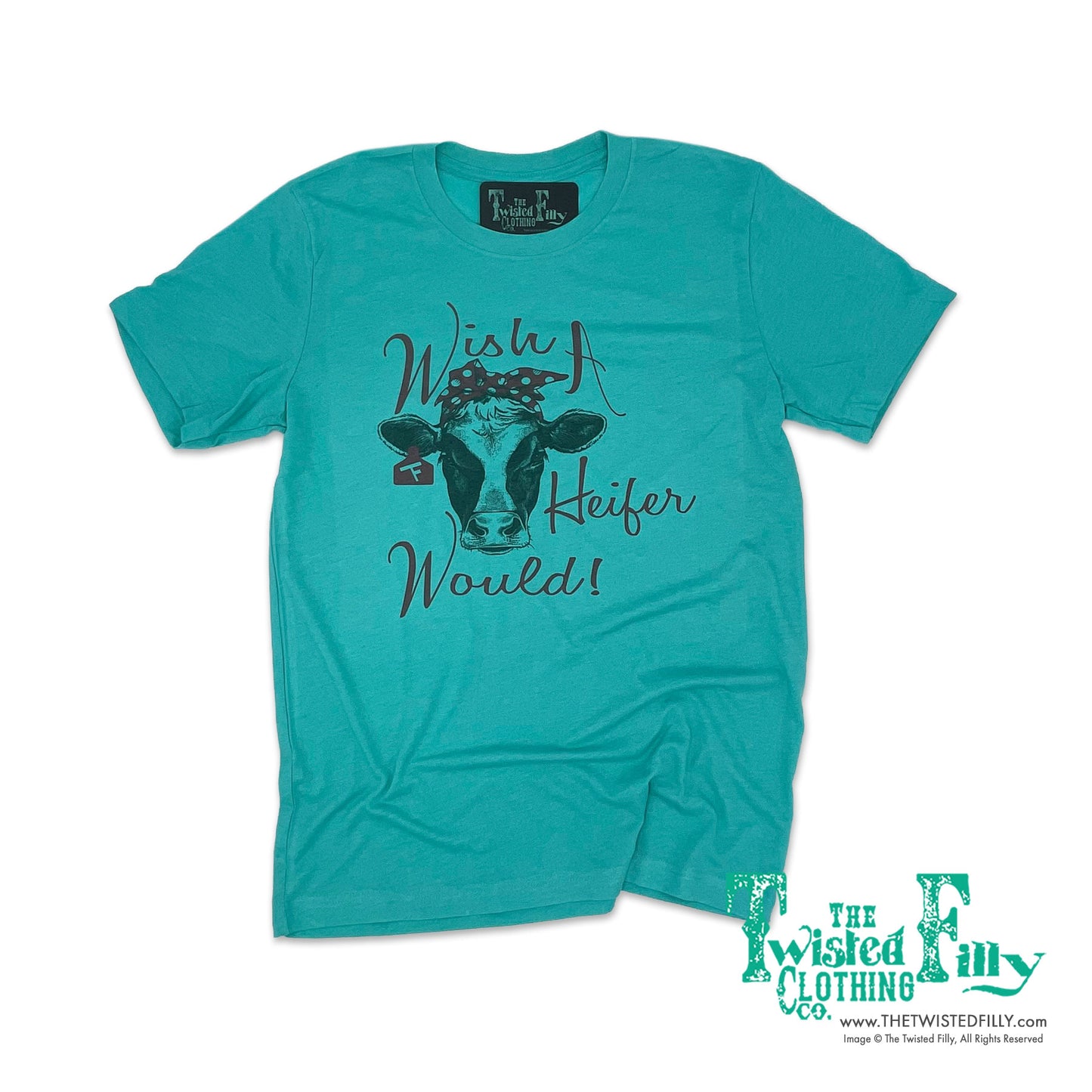 Make your statement confidently with this Wish A Heifer Would women's playful, turquoise tee – because nothing says "snarky but friendly" like a Wish A Heifer Would shirt! (You know, in case you're not a fan of the usual mooing).